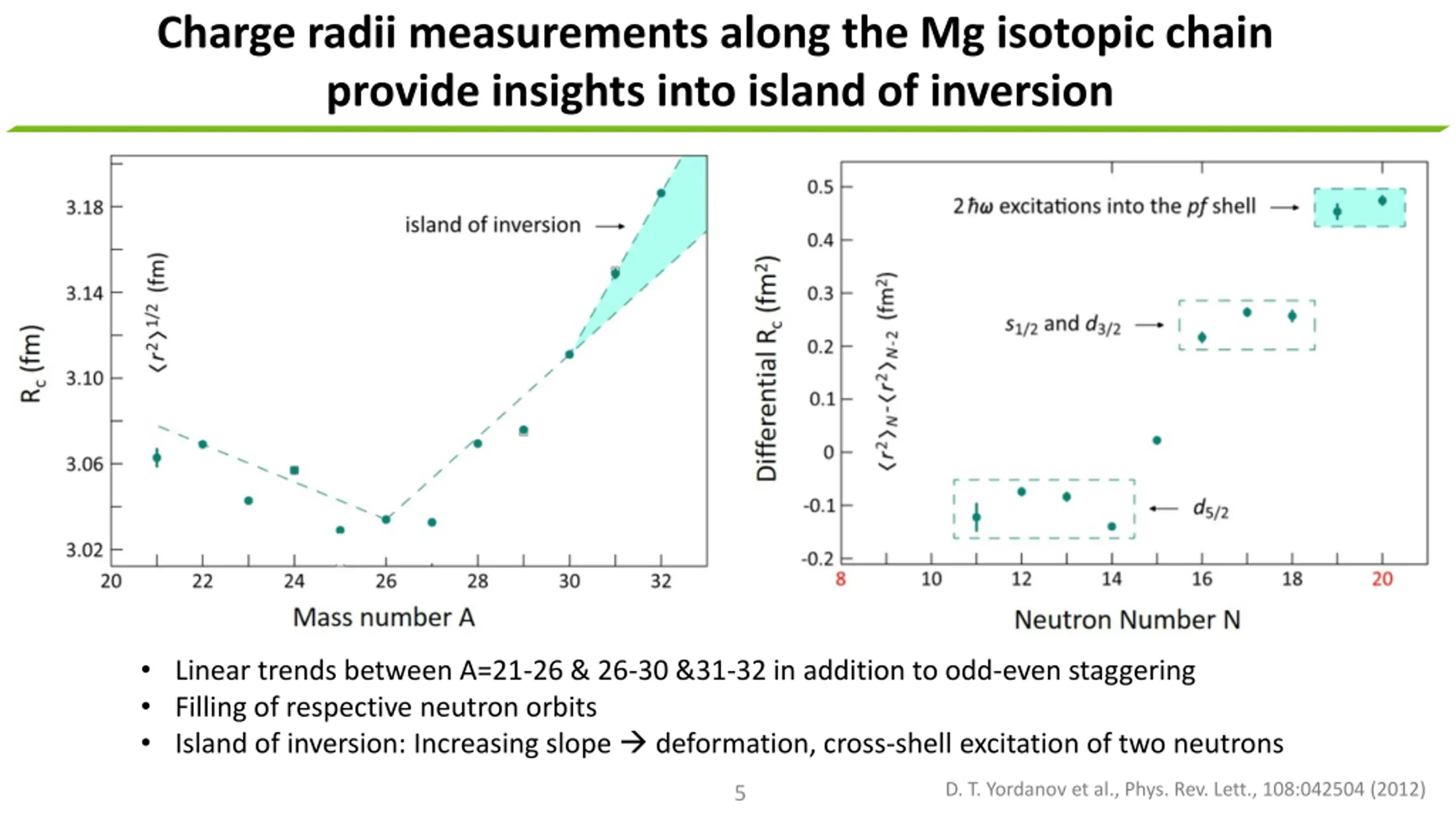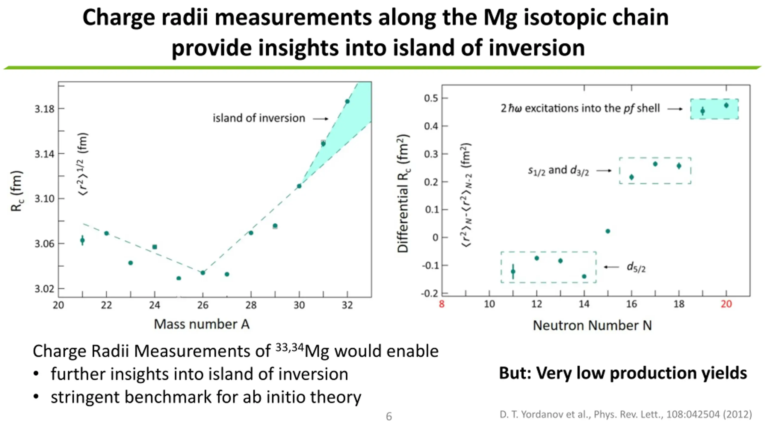 Charge radii measurements along the Mg isotopic chain provide insights into island of inversion Linear trends between A=21-26 & 26-30 &31-32 in addition to odd-even staggering Filling of respective neutron orbits Island of inversion: Increasing slope deformation, cross-shell excitation of two neutrons D. T. Yordanov et al., Phys. Rev. Lett., 108:042504 (2012) 5