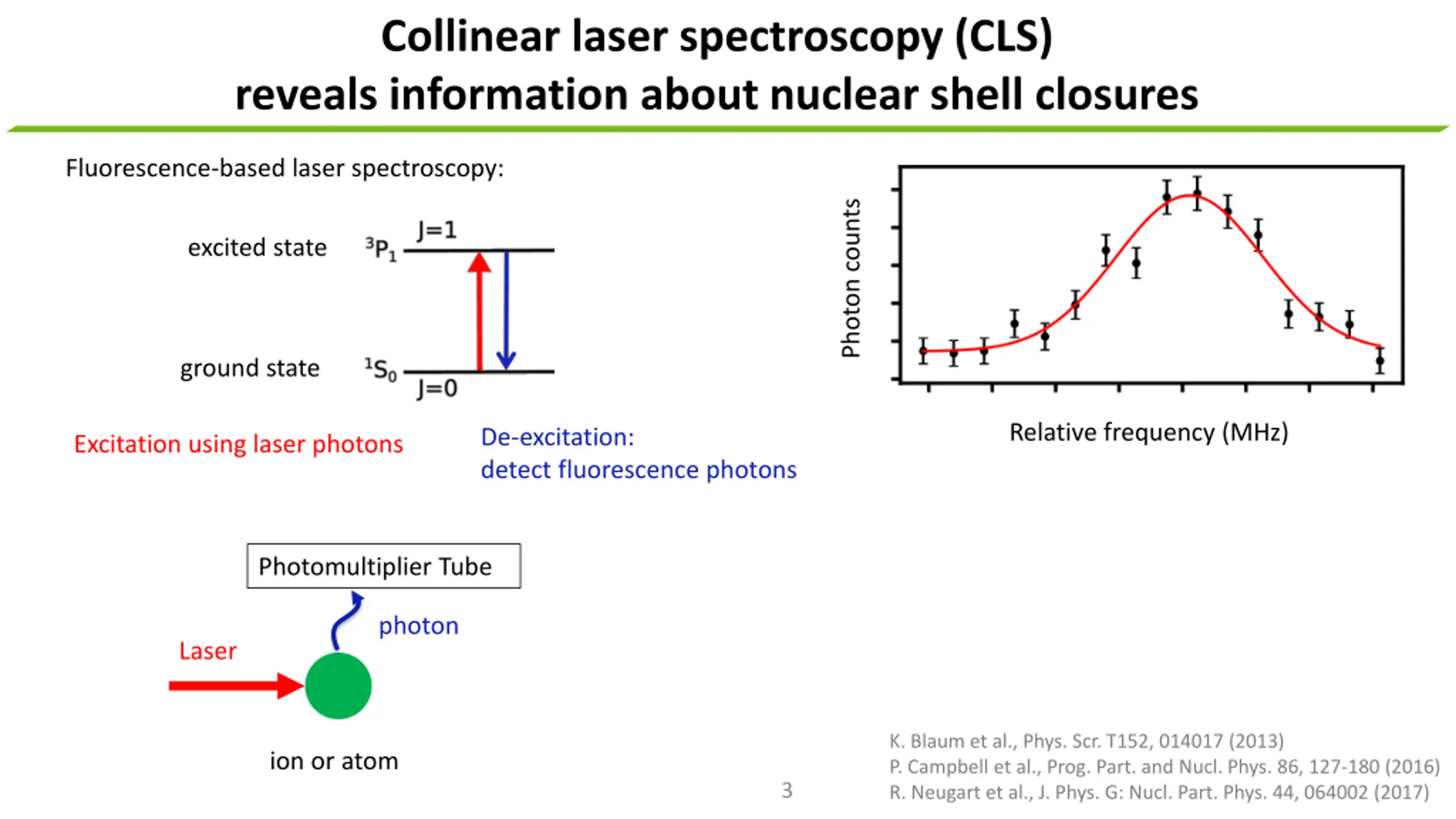 Collinear laser spectroscopy (CLS) reveals information about nuclear shell closures Fluorescence-based laser spectroscopy: Photon counts excited state ground state Relative frequency (MHz) De-excitation: detect fluorescence photons Excitation using laser photons Photomultiplier Tube photon Laser K. Blaum et al., Phys. Scr. T152, 014017 (2013) P. Campbell et al., Prog. Part. and Nucl. Phys. 86, 127-180 (2016) R. Neugart et al., J. Phys. G: Nucl. Part. Phys. 44, 064002 (2017) ion or atom 3