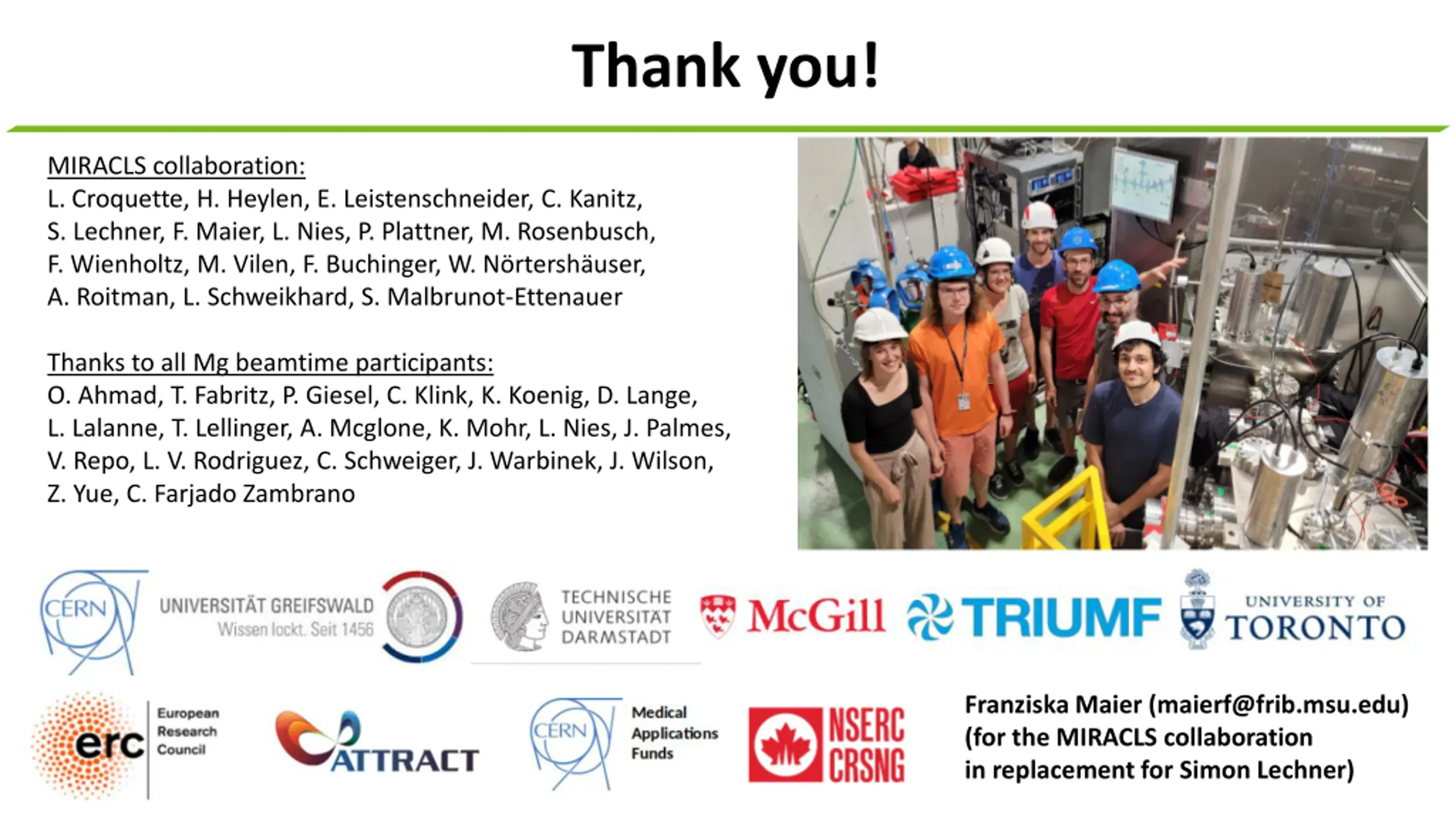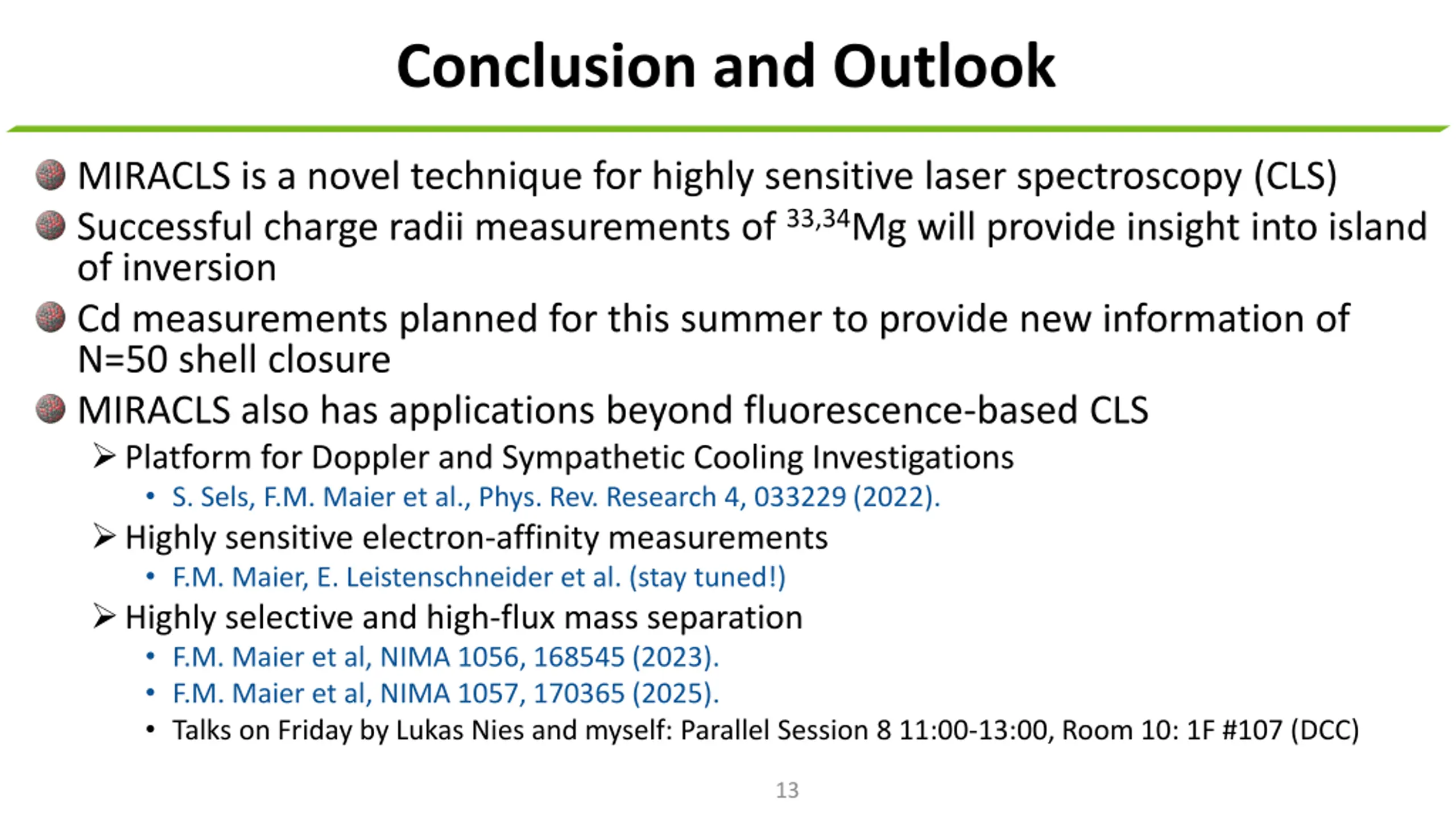 Conclusion and Outlook MIRACLS is a novel technique for highly sensitive laser spectroscopy (CLS) Successful charge radii measurements of 33,34Mg will provide insight into island of inversion Cd measurements planned for this summer to provide new information of N=50 shell closure MIRACLS also has applications beyond fluorescence-based CLS Platform for Doppler and Sympathetic Cooling Investigations S. Sels, F.M. Maier et al., Phys. Rev. Research 4, 033229 (2022). Highly sensitive electron-affinity measurements F.M. Maier, E. Leistenschneider et al. (stay tuned!) Highly selective and high-flux mass separation F.M. Maier et al, NIMA 1056, 168545 (2023). F.M. Maier et al, NIMA 1057, 170365 (2025). Talks on Friday by Lukas Nies and myself: Parallel Session 8 11:00-13:00, Room 10: 1F #107 (DCC) 13