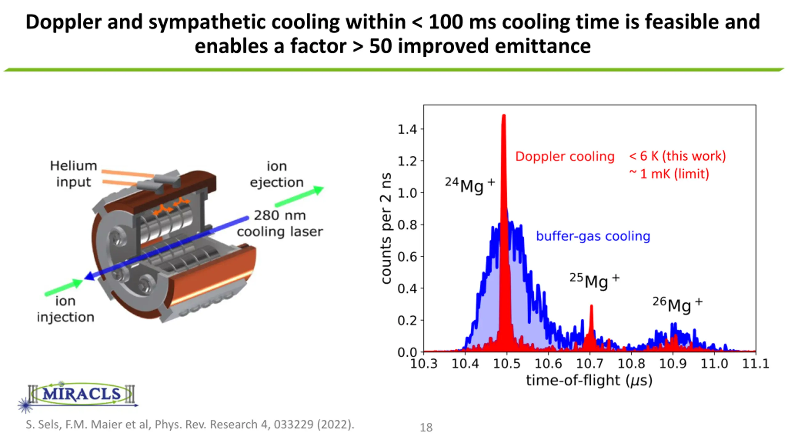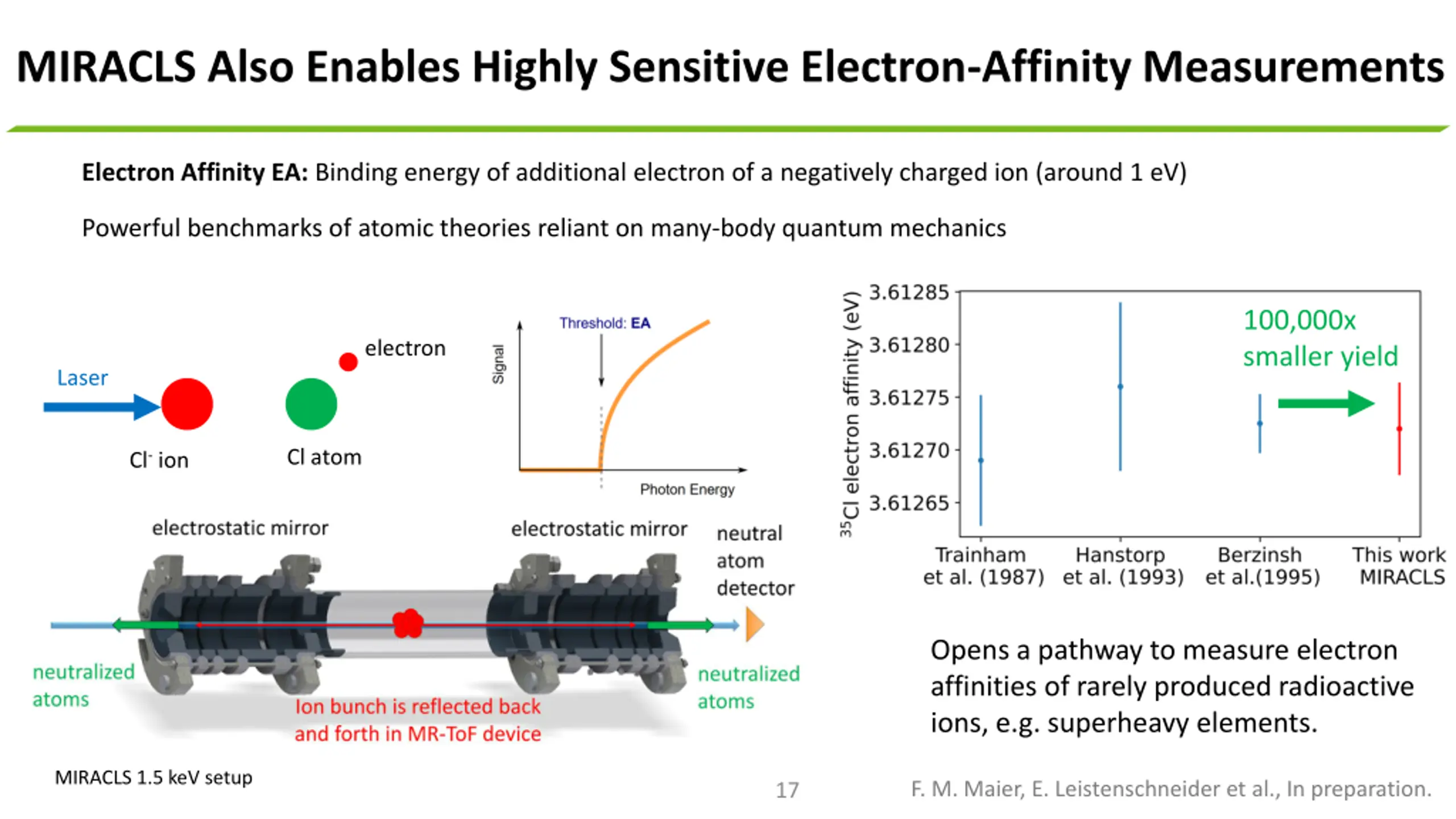 The MIRACLS technique enables an increased sensitivity First MR-ToF device worldwide that stores ions at 10.5 keV beam energy as required to maintain high resolution Linewidth: ? ? Photomultiplier tube ? Laser stored ion bunch > 50% capture efficiency electrostatic mirror electrostatic mirror F.M. Maier, M. Vilen et al., NIMA 1048, 167927 (2023). F.M. Maier et al., NIMA 1057, 170365 (2025). 10