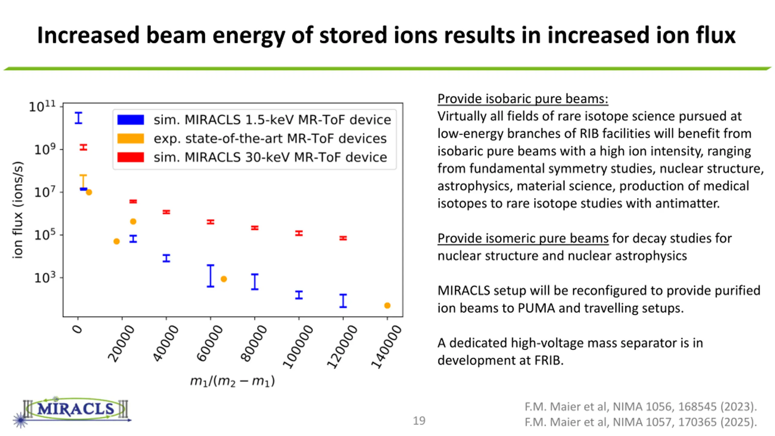 Increased beam energy of stored ions results in increased ion flux Provide isobaric pure beams: Virtually all fields of rare isotope science pursued at low-energy branches of RIB facilities will benefit from isobaric pure beams with a high ion intensity, ranging from fundamental symmetry studies, nuclear structure, astrophysics, material science, production of medical isotopes to rare isotope studies with antimatter. Provide isomeric pure beams for decay studies for nuclear structure and nuclear astrophysics MIRACLS setup will be reconfigured to provide purified ion beams to PUMA and travelling setups. A dedicated high-voltage mass separator is in development at FRIB. F.M. Maier et al, NIMA 1056, 168545 (2023). F.M. Maier et al, NIMA 1057, 170365 (2025). 19
