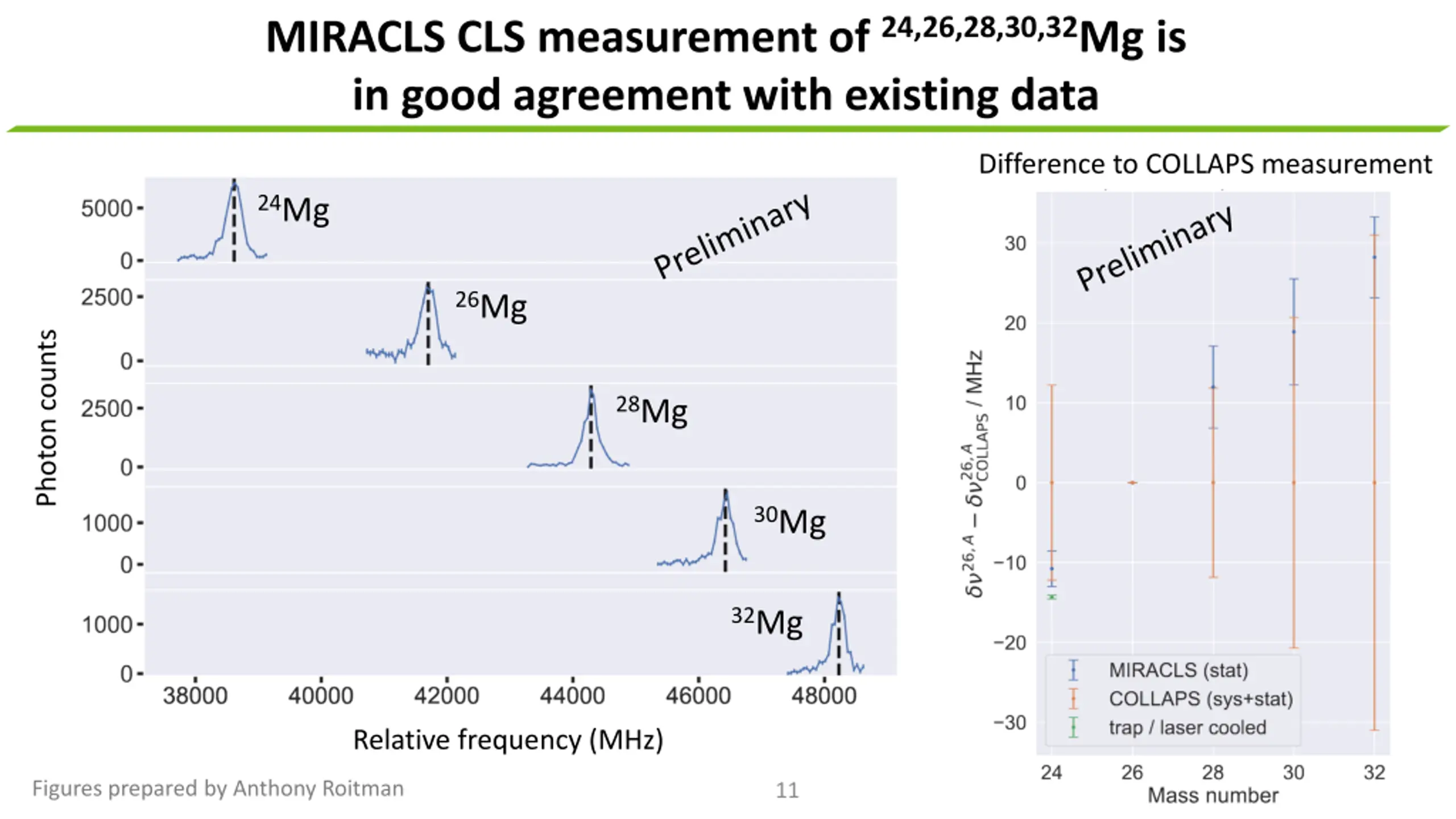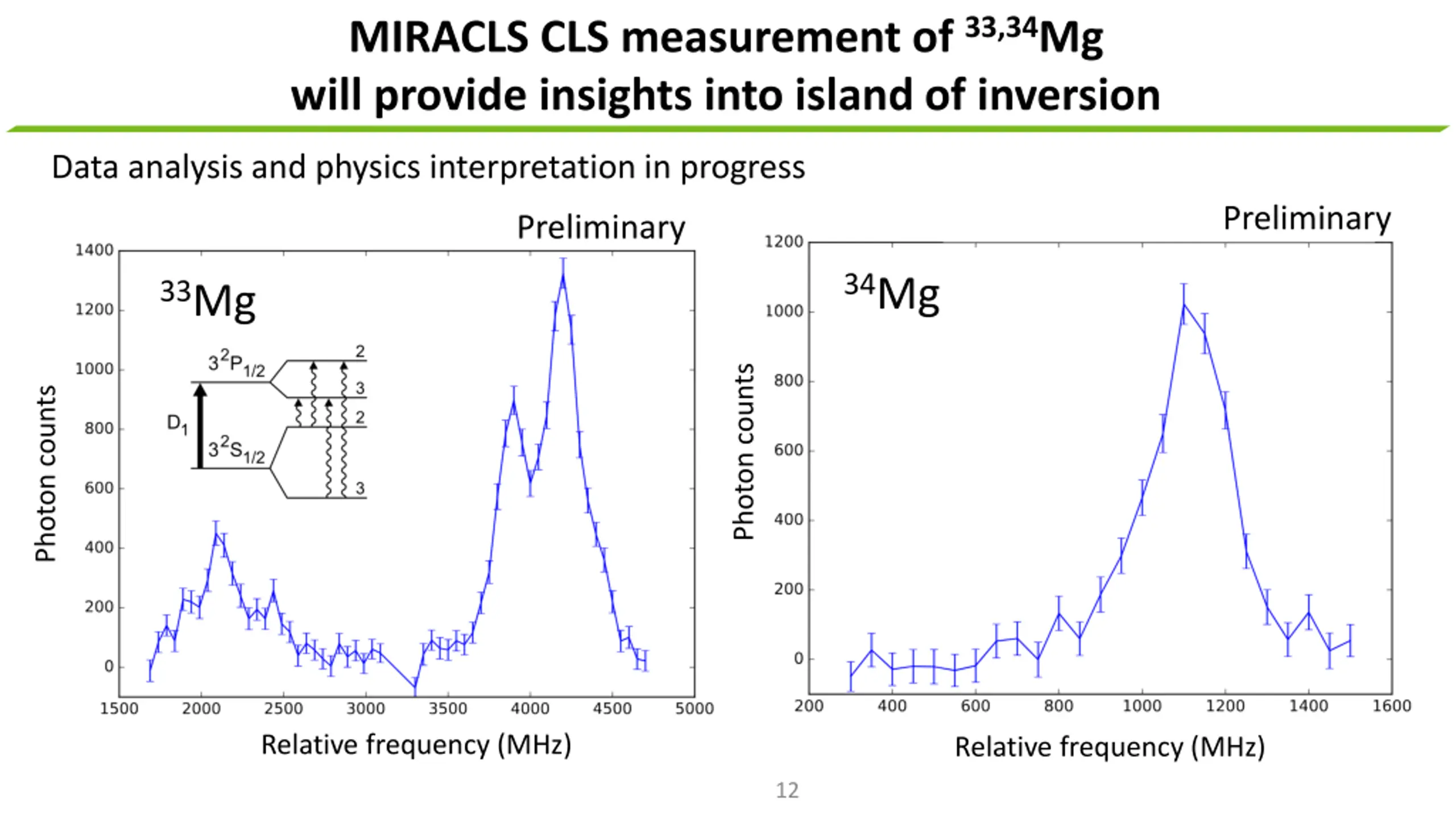 MIRACLS CLS measurement of 33,34Mg will provide insights into island of inversion Data analysis and physics interpretation in progress Preliminary Preliminary 34Mg 33Mg Photon counts Photon counts Relative frequency (MHz) Relative frequency (MHz) 12