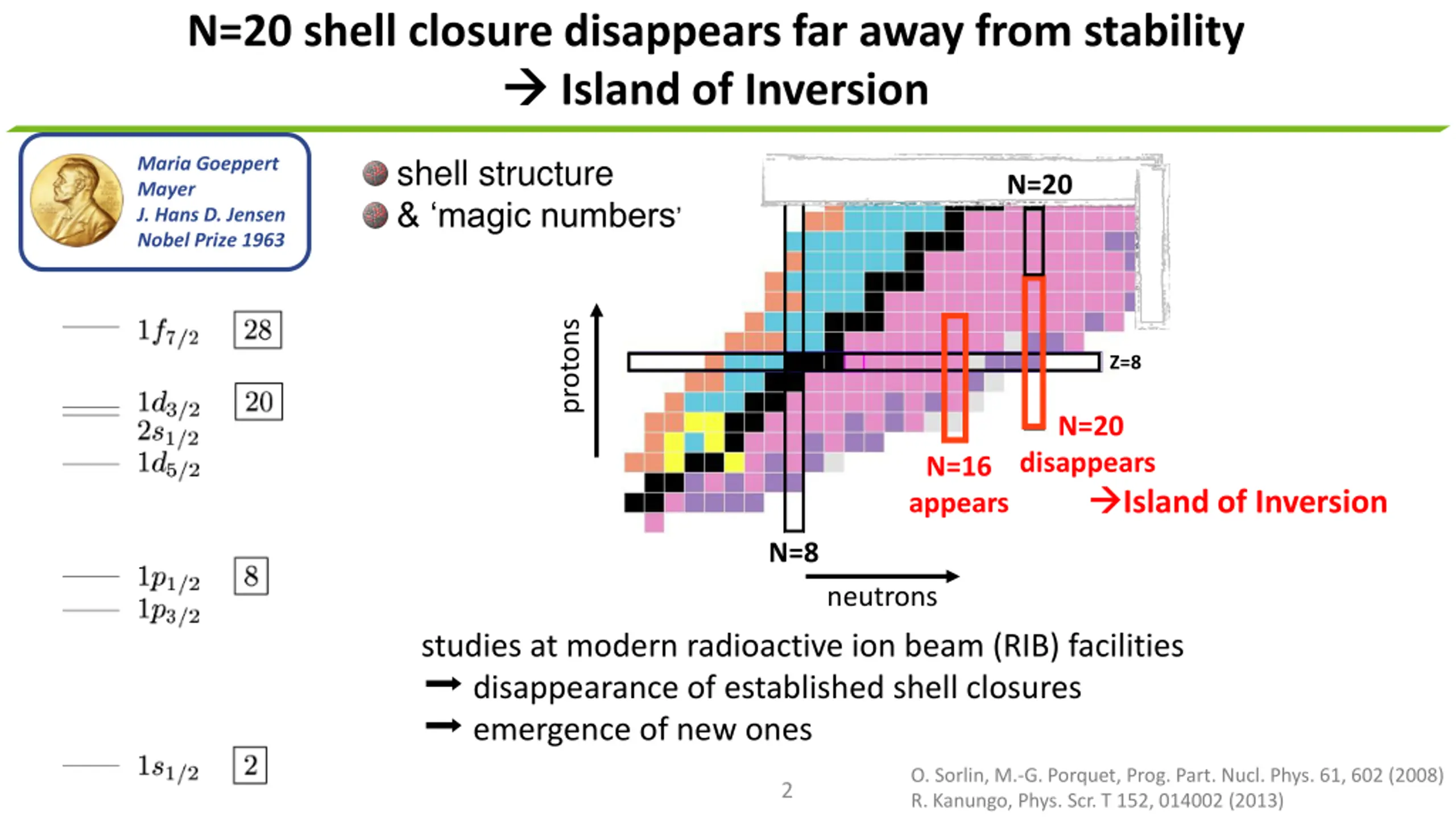 N=20 shell closure disappears far away from stability Island of Inversion shell structure & magic numbers Maria Goeppert Mayer J. Hans D. Jensen Nobel Prize 1963 N=20 protons Z=8 N=20 disappears Island of Inversion N=16 appears N=8 neutrons studies at modern radioactive ion beam (RIB) facilities disappearance of established shell closures emergence of new ones O. Sorlin, M.-G. Porquet, Prog. Part. Nucl. Phys. 61, 602 (2008) R. Kanungo, Phys. Scr. T 152, 014002 (2013) 2