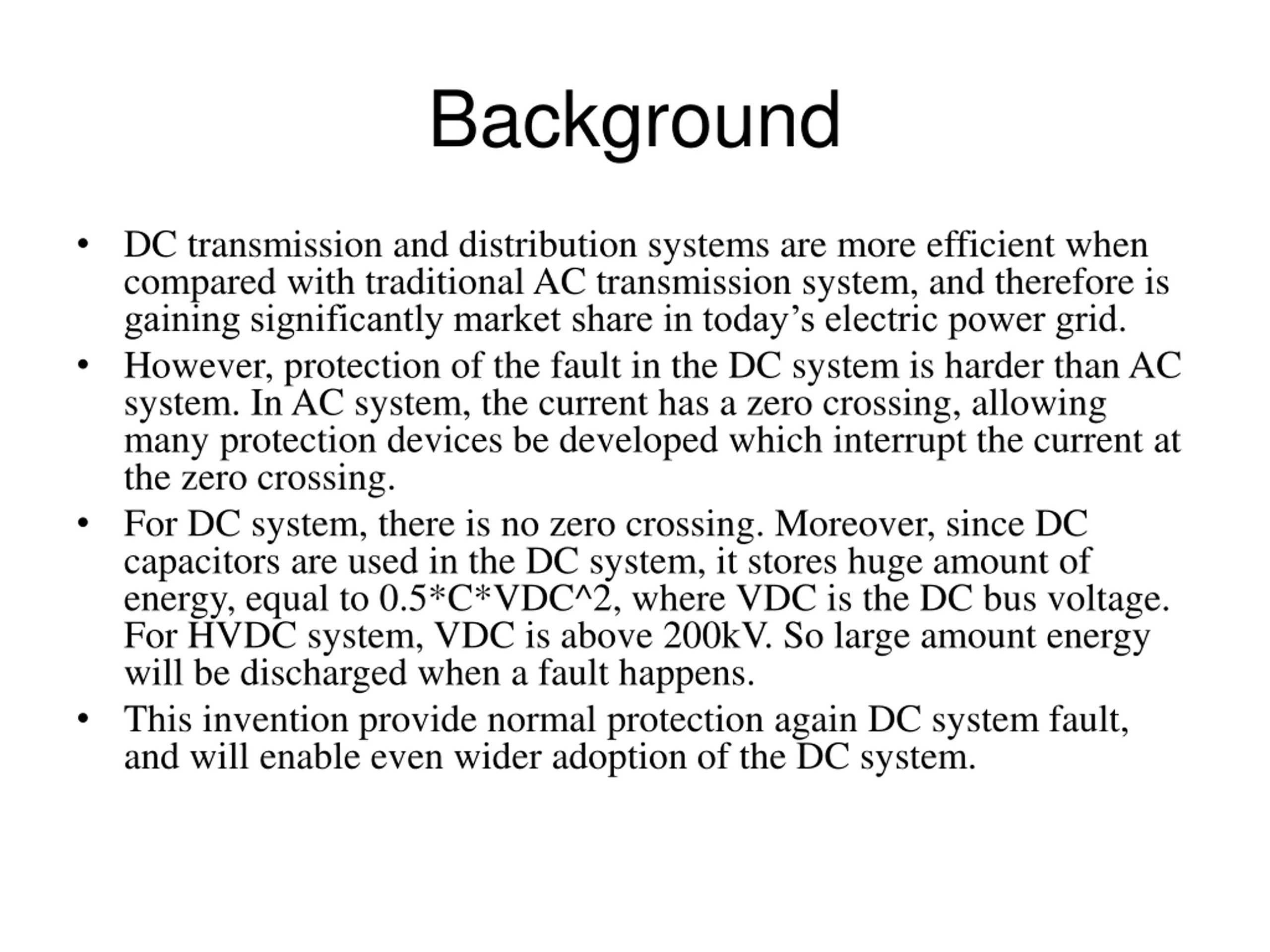Background DC transmission and distribution systems are more efficient when compared with traditional AC transmission system, and therefore is gaining significantly market share in today s electric power grid. However, protection of the fault in the DC system is harder than AC system. In AC system, the current has a zero crossing, allowing many protection devices be developed which interrupt the current at the zero crossing. For DC system, there is no zero crossing. Moreover, since DC capacitors are used in the DC system, it stores huge amount of energy, equal to 0.5*C*VDC^2, where VDC is the DC bus voltage. For HVDC system, VDC is above 200kV. So large amount energy will be discharged when a fault happens. This invention provide normal protection again DC system fault, and will enable even wider adoption of the DC system.