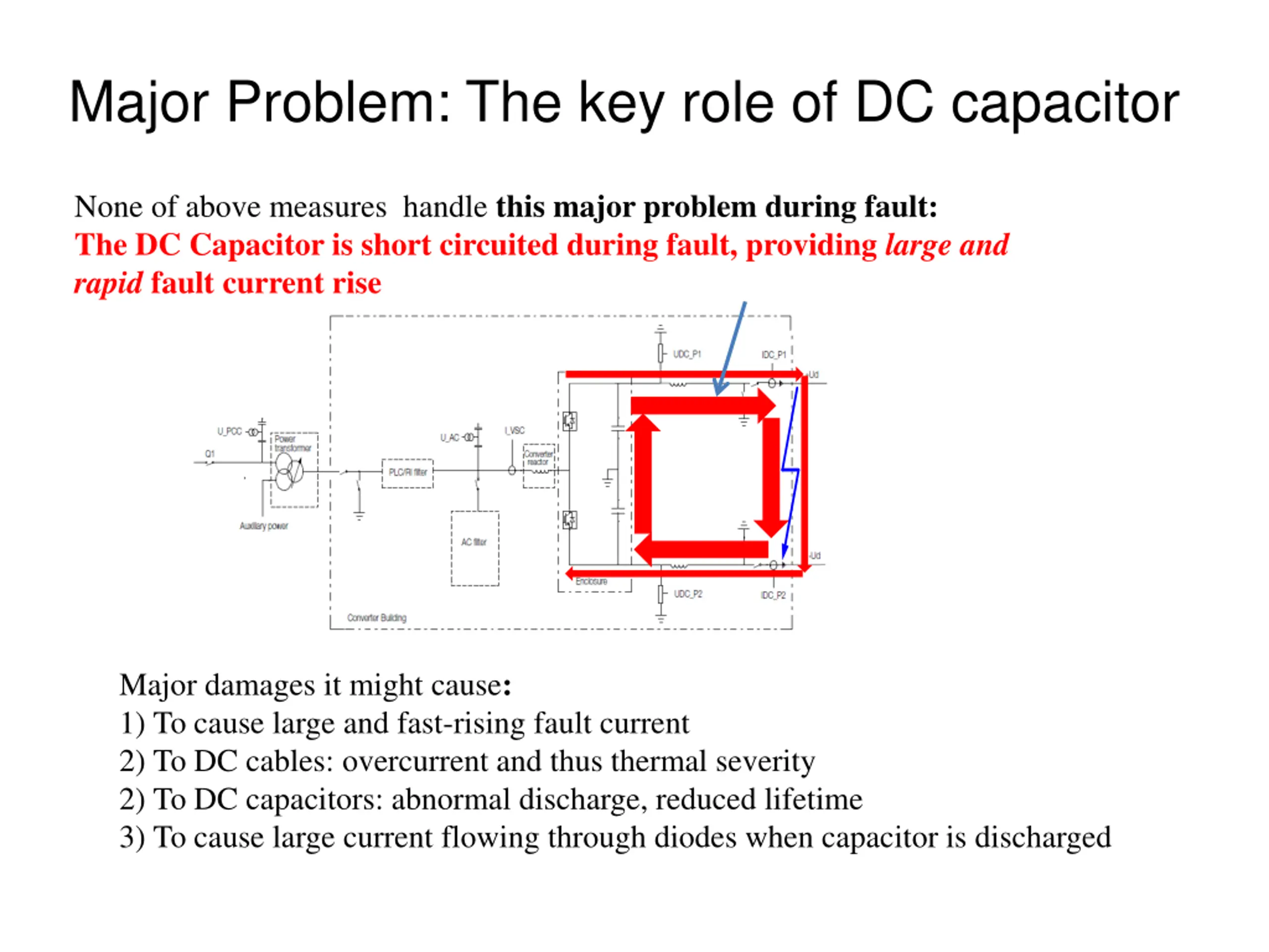 Major Problem: The key role of DC capacitor None of above measures handle this major problem during fault: The DC Capacitor is short circuited during fault, providing large and rapid fault current rise Major damages it might cause: 1) To cause large and fast-rising fault current 2) To DC cables: overcurrent and thus thermal severity 2) To DC capacitors: abnormal discharge, reduced lifetime 3) To cause large current flowing through diodes when capacitor is discharged