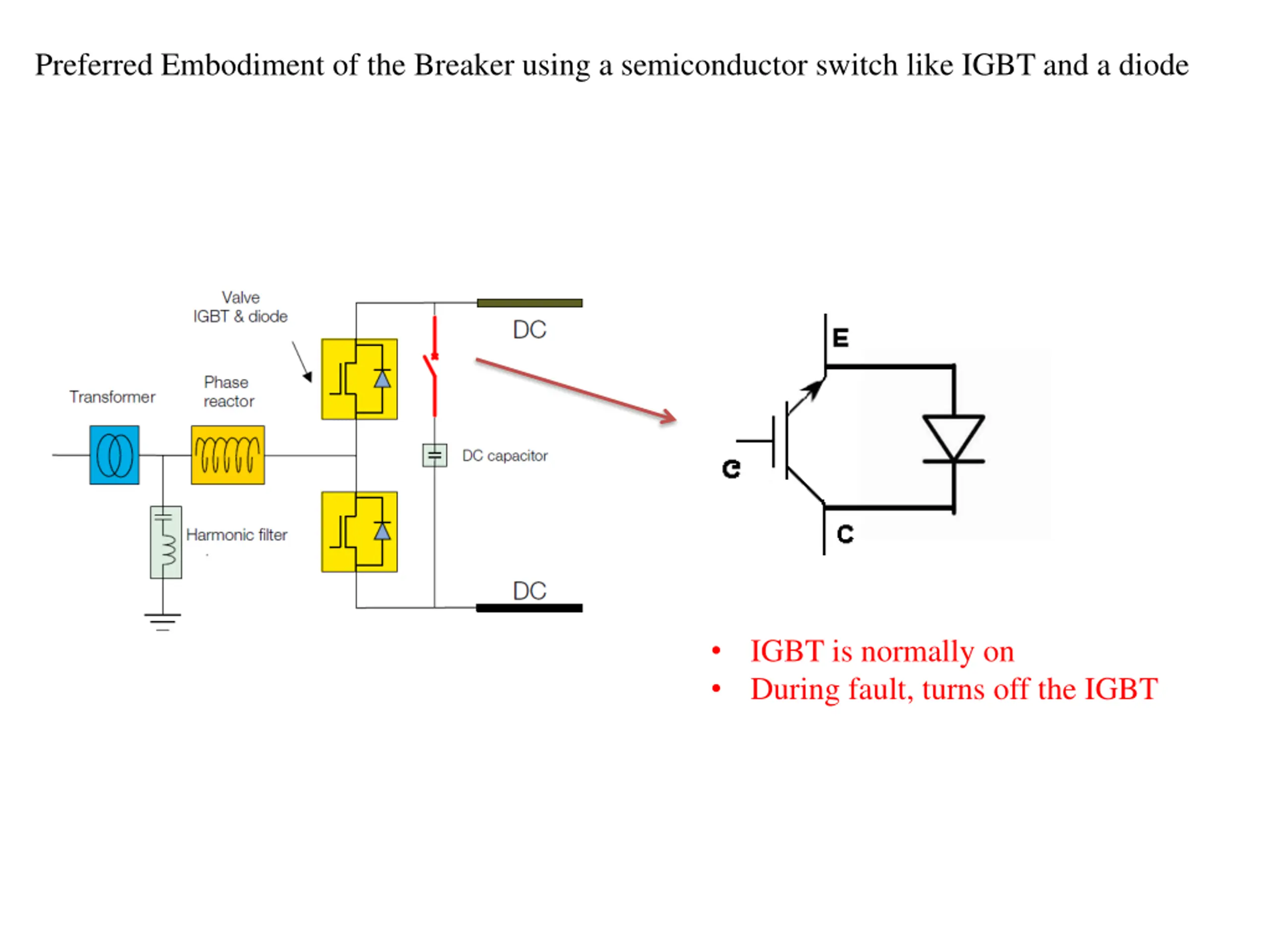 Preferred Embodiment of the Breaker using a semiconductor switch like IGBT and a diode IGBT is normally on During fault, turns off the IGBT