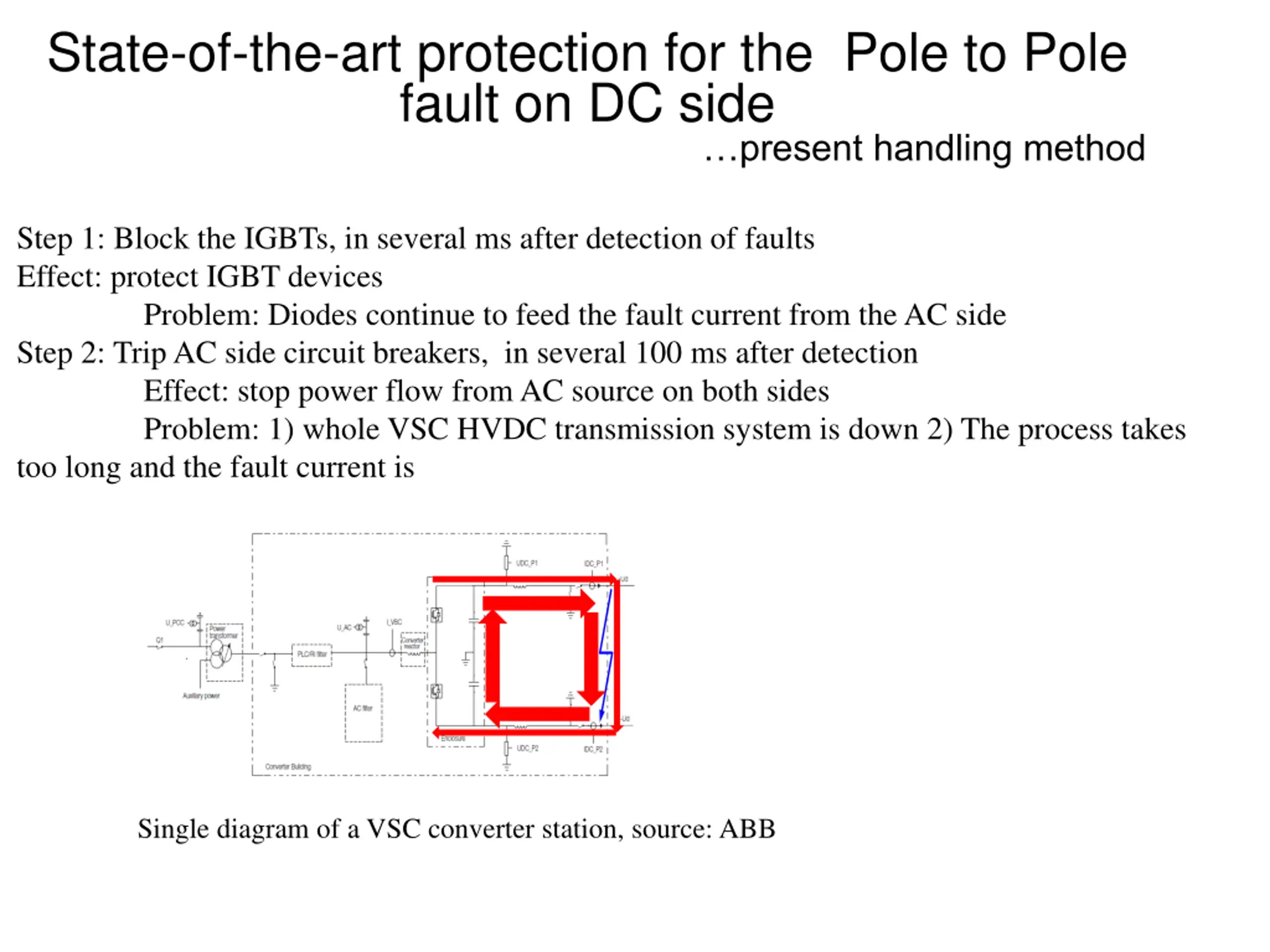 State-of-the-art protection for the Pole to Pole fault on DC side present handling method Step 1: Block the IGBTs, in several ms after detection of faults Effect: protect IGBT devices Problem: Diodes continue to feed the fault current from the AC side Step 2: Trip AC side circuit breakers, in several 100 ms after detection Effect: stop power flow from AC source on both sides Problem: 1) whole VSC HVDC transmission system is down 2) The process takes too long and the fault current is Single diagram of a VSC converter station, source: ABB