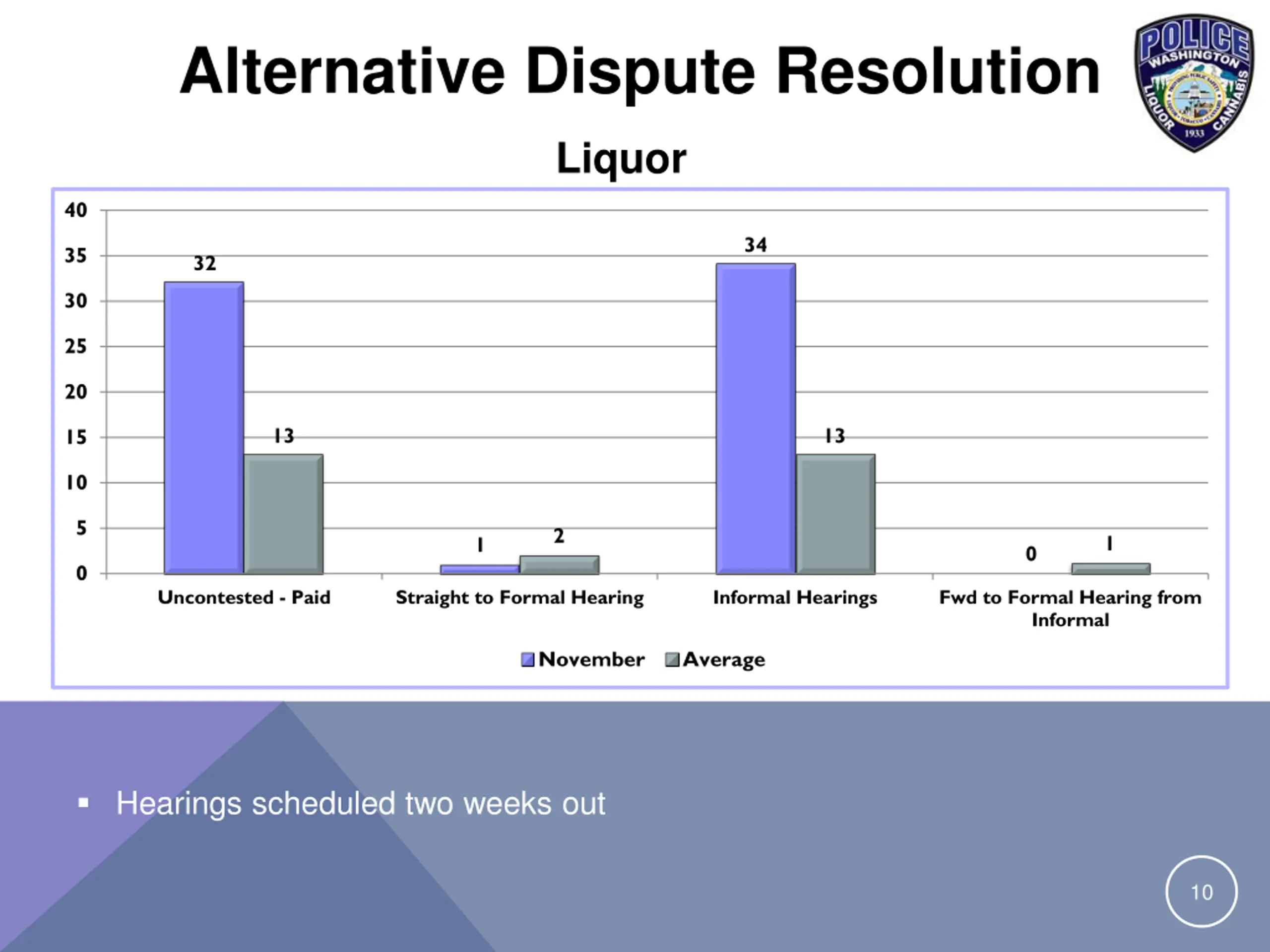 Alternative Dispute Resolution Liquor 40 34 35 32 30 25 20 13 13 15 10 5 2 1 1 0 0 Uncontested - Paid Straight to Formal Hearing Informal Hearings Fwd to Formal Hearing from Informal November Average Hearings scheduled two weeks out 10