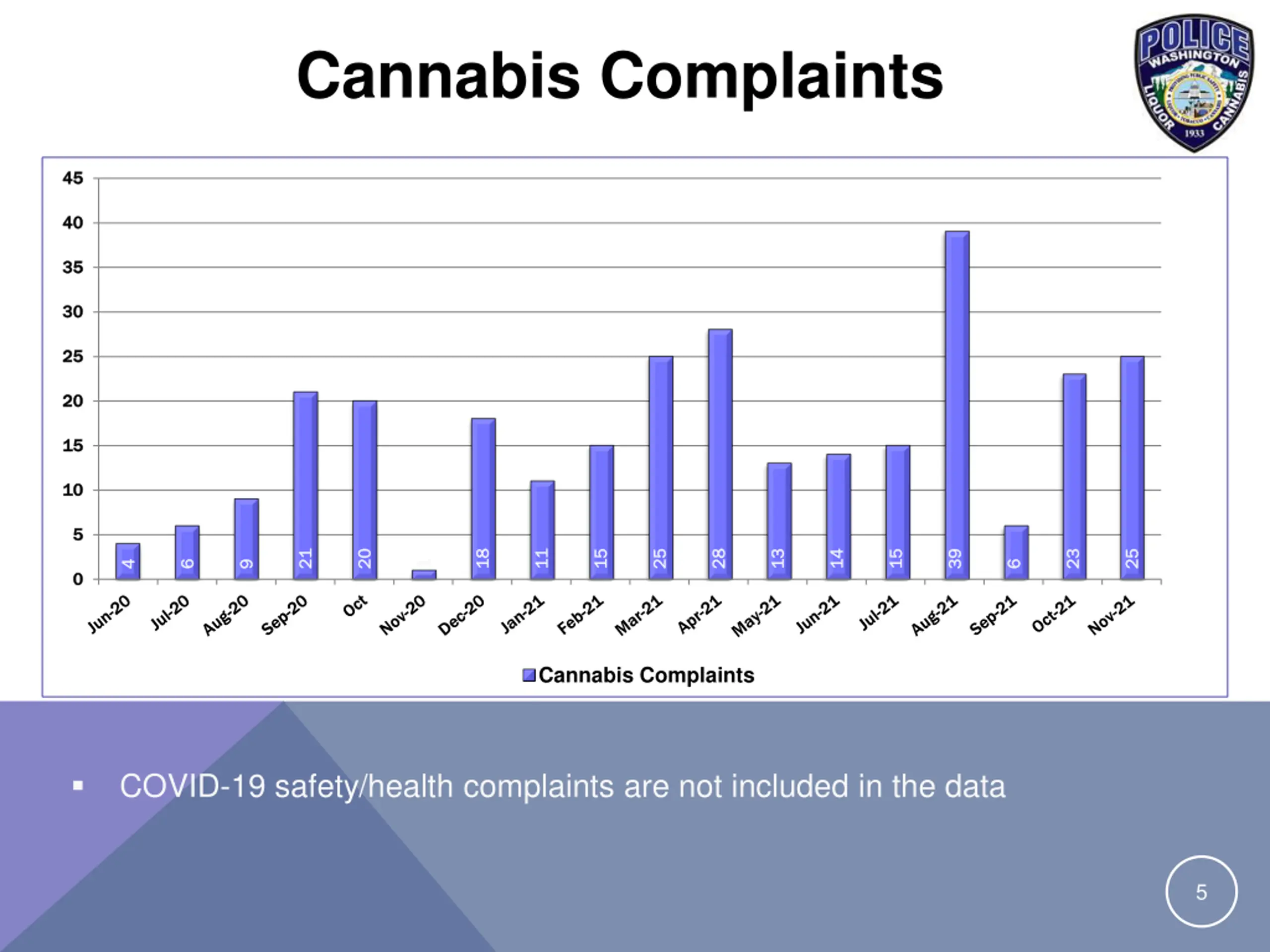 Enforcement: Complaints November 2021 Summary COVID-19 complaints have over the last quarter been the number one compliant received Met goal of 95% of complaints closed out within 60 days* There were 385 complaints logged with enforcement in the month of November There were 25 complaints against the cannabis industry, 332 in liquor and 28 in tobacco/vapor 75% of complaints were COVID-19 related Days 1-10 11-30 31-60 60+ Closed 68% 25% 6% 1% Division goal is to close out 95% of complaints within 60 days 4 *Data based on last 90 days