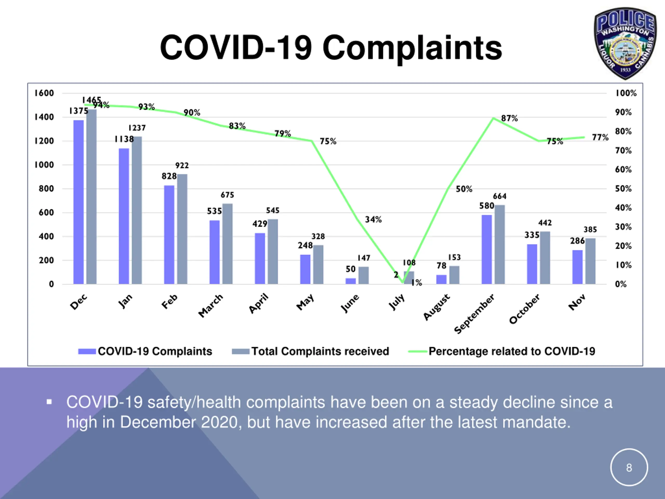 Tobacco Complaints 45 45 40 40 35 35 30 30 25 25 20 20 15 15 10 10 5 5 21 21 29 29 22 22 40 40 15 15 28 28 17 17 27 27 21 21 13 13 22 22 36 36 28 28 10 10 22 22 26 26 23 23 9 9 0 0 Tobacco/Vapor Complaints COVID-19 safety/health complaints are not included in the data 7