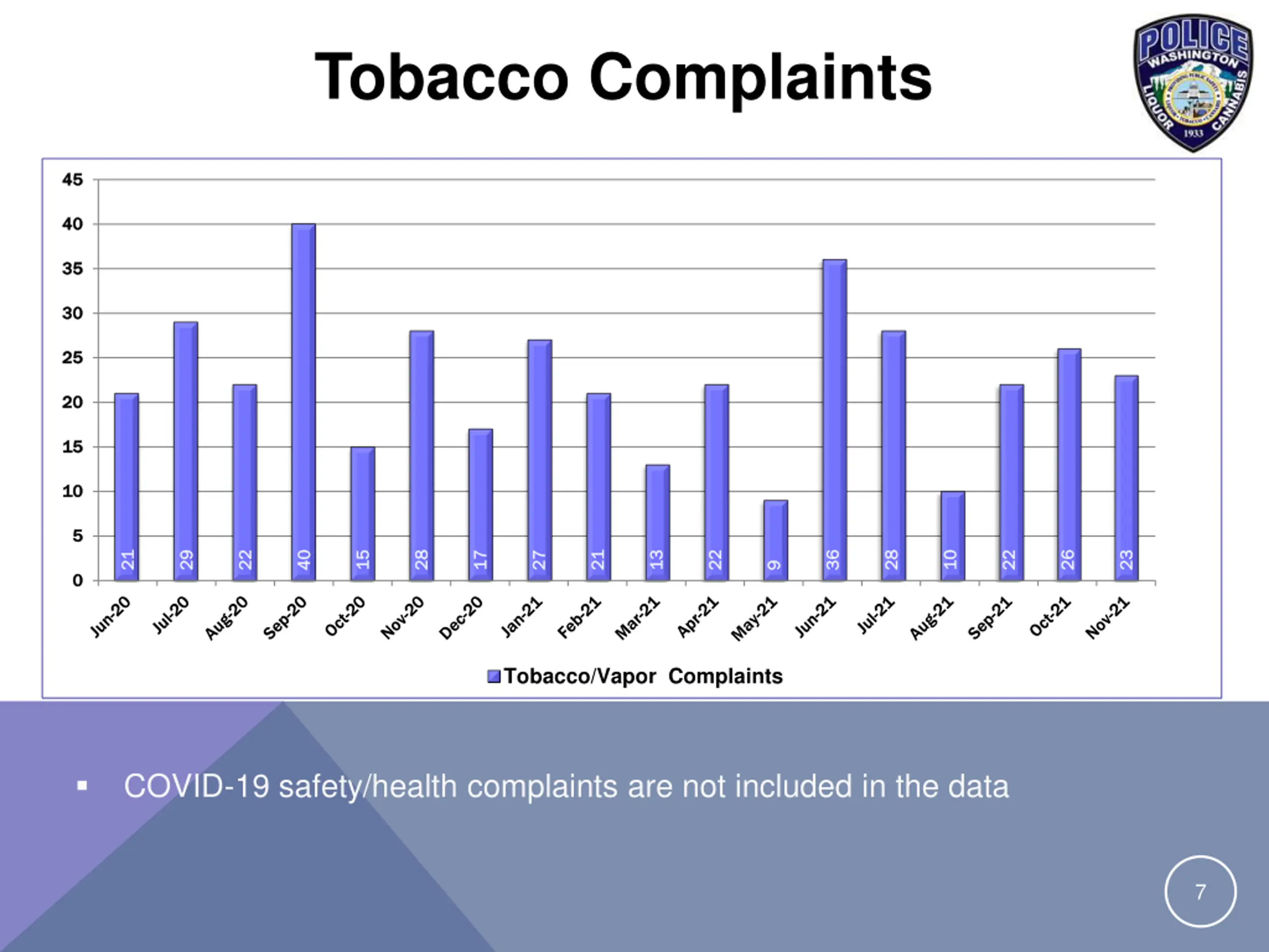 Liquor Complaints 250 250 200 200 150 150 100 100 50 50 194 194 104 104 61 61 84 84 83 83 38 38 53 53 48 48 41 41 43 43 98 98 65 65 93 93 65 65 36 36 68 68 58 58 66 66 0 0 Jun-20 Jun-20 Jul-20 Jul-20 Aug-20 Aug-20 Sept Sept Oct-20 Oct-20 Nov-20 Nov-20 Dec-20 Dec-20 Jan-21 Jan-21 Feb-21 Feb-21 Mar-21 Mar-21 Apr-21 Apr-21 May-21 May-21 Jun-21 Jun-21 Jul-21 Jul-21 Aug-21 Aug-21 Sep-21 Sep-21 Oct-21 Oct-21 Nov-21 Nov-21 Liquor Complaints COVID-19 safety/health complaints are not included in the data 6