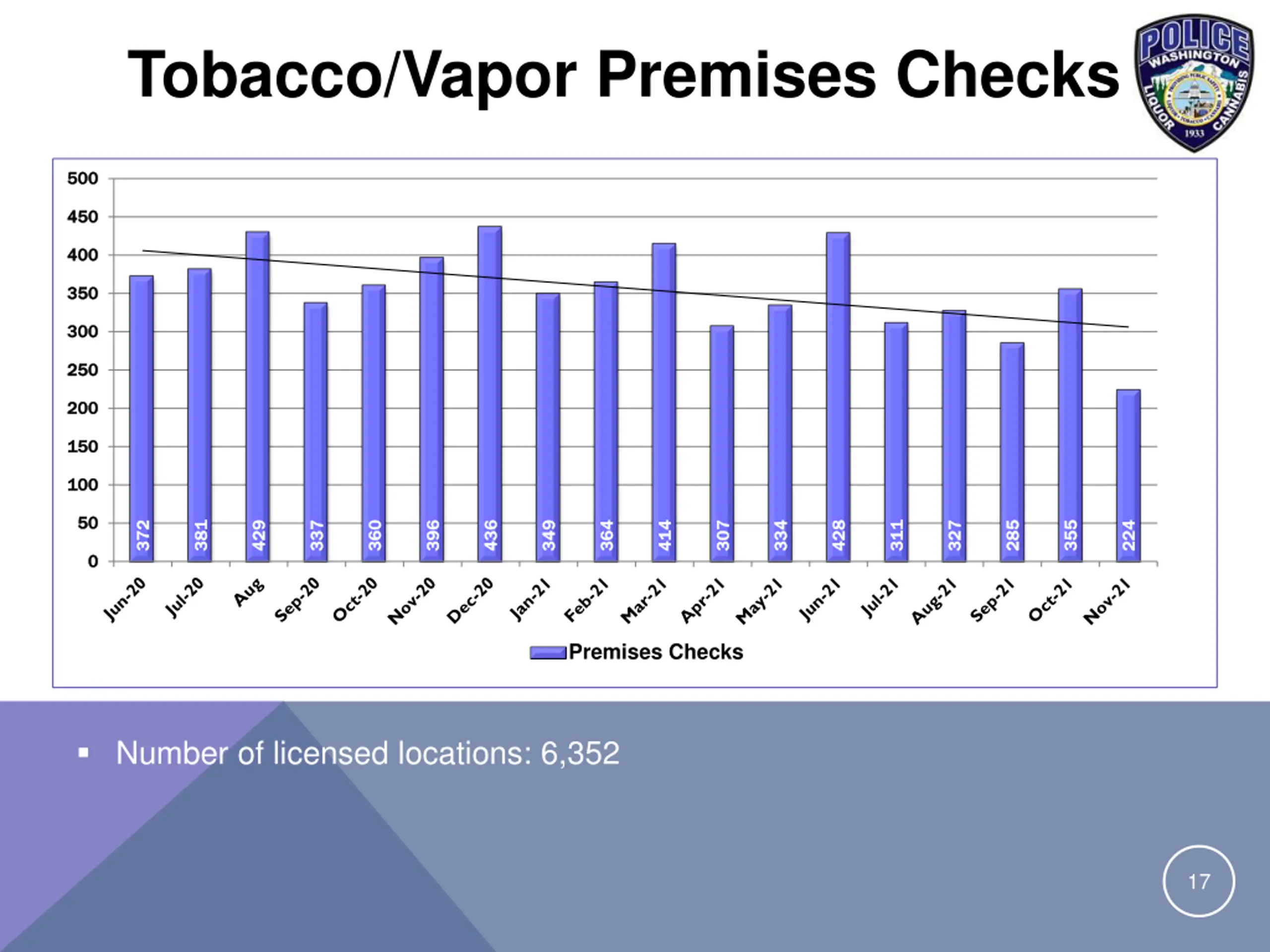 Tobacco/Vapor Premises Checks 500 500 450 450 400 400 350 350 300 300 250 250 200 200 150 150 100 100 50 50 372 372 381 381 429 429 337 337 360 360 396 396 436 436 349 349 364 364 414 414 307 307 334 334 428 428 311 311 327 327 285 285 355 355 224 224 0 0 Premises Checks Number of licensed locations: 6,352 17