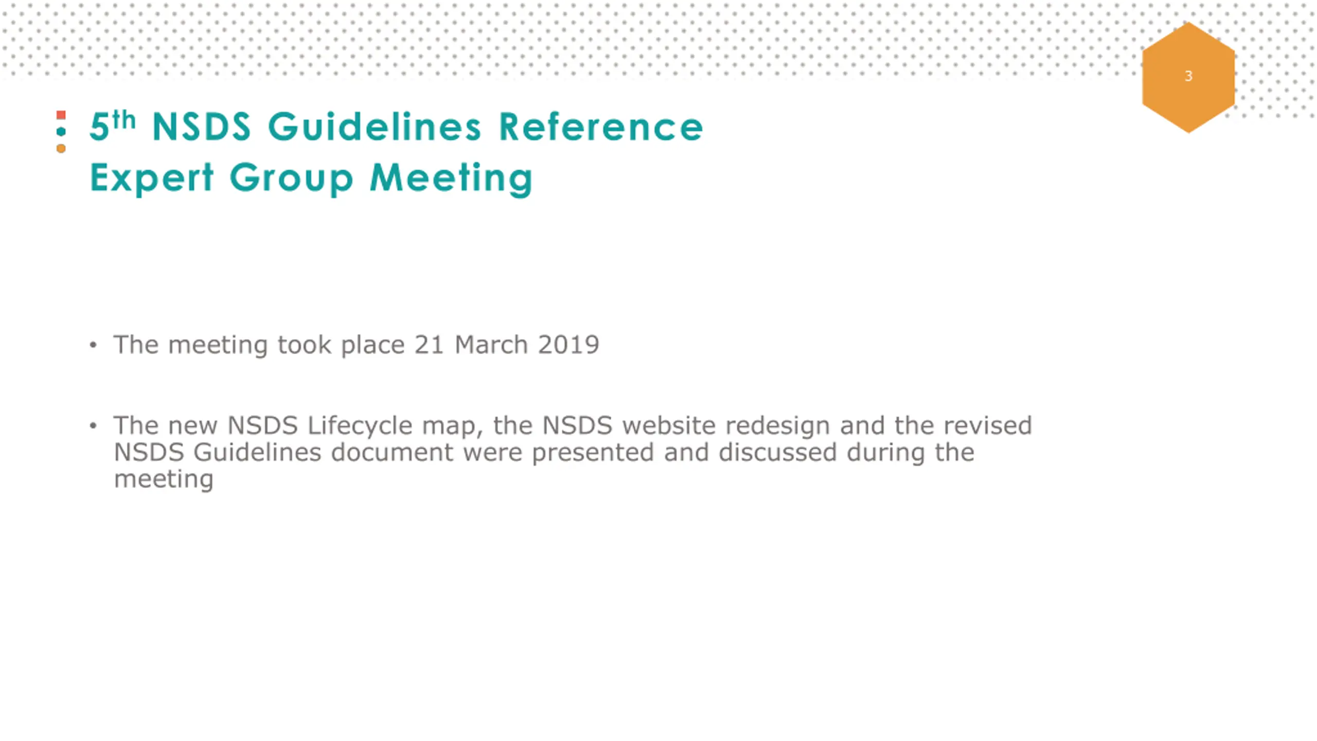 3 5th NSDS Guidelines Reference Expert Group Meeting The meeting took place 21 March 2019 The new NSDS Lifecycle map, the NSDS website redesign and the revised NSDS Guidelines document were presented and discussed during the meeting