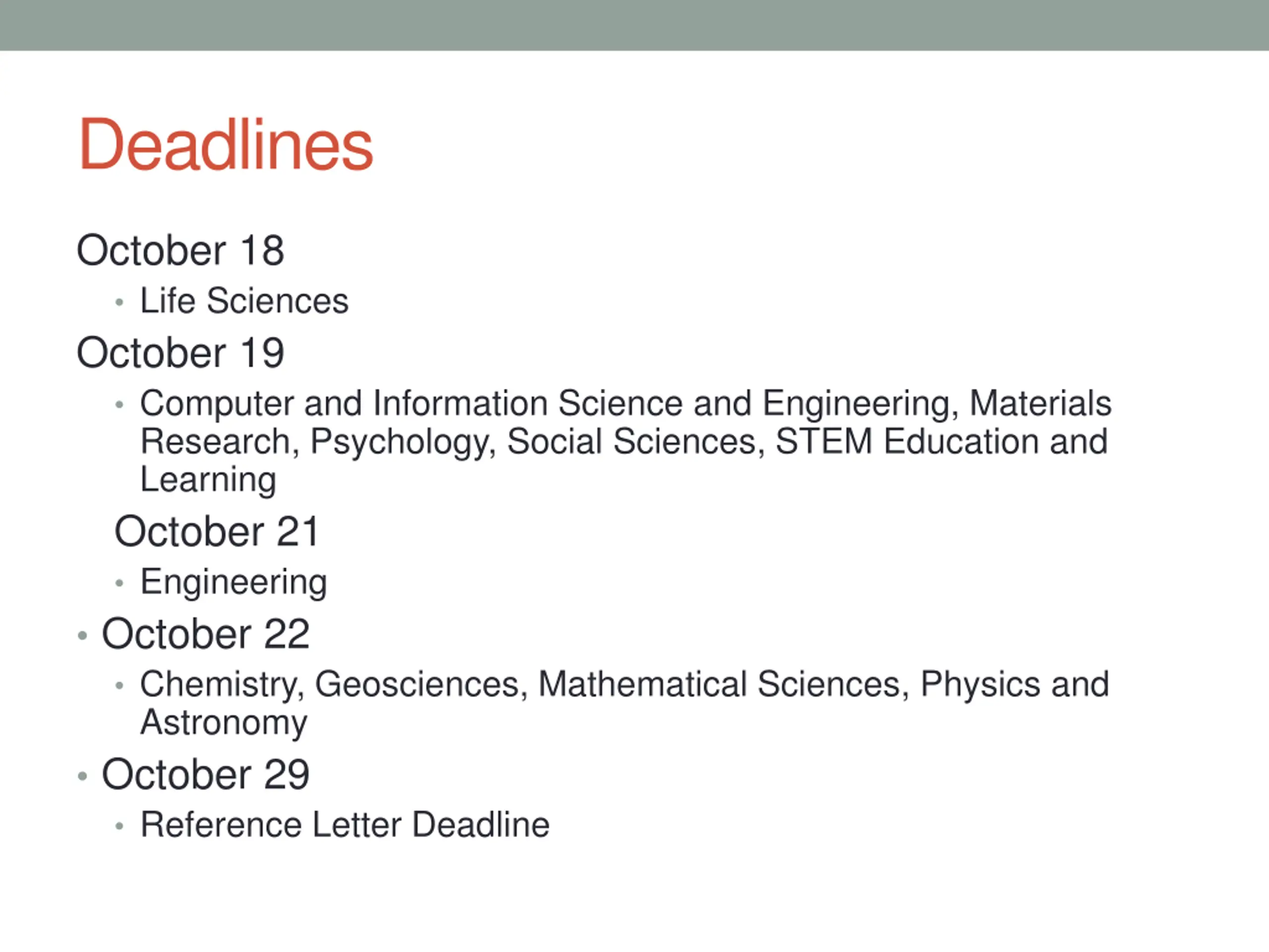 Deadlines October 18 Life Sciences October 19 Computer and Information Science and Engineering, Materials Research, Psychology, Social Sciences, STEM Education and Learning October 21 Engineering October 22 Chemistry, Geosciences, Mathematical Sciences, Physics and Astronomy October 29 Reference Letter Deadline