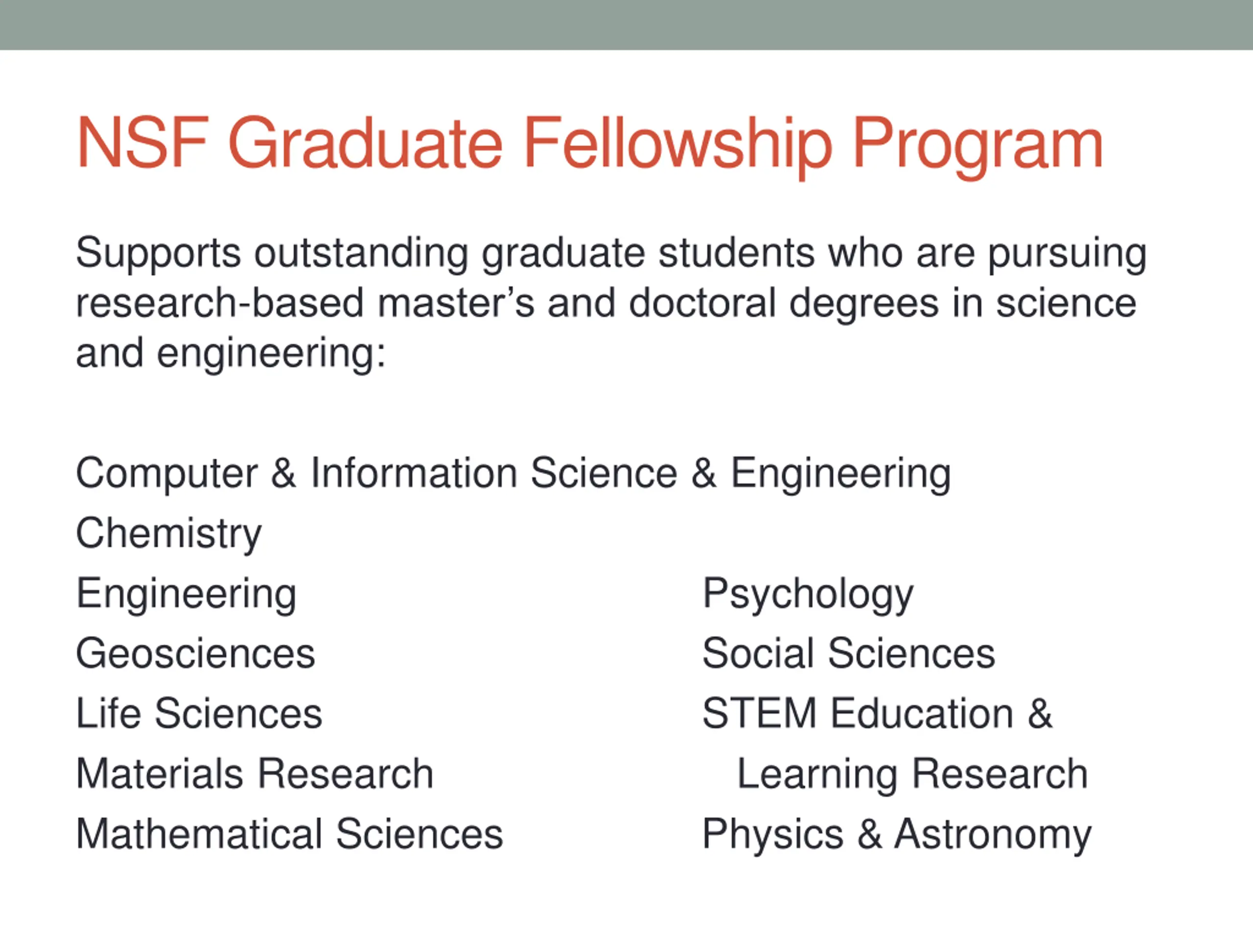 NSF Graduate Fellowship Program Supports outstanding graduate students who are pursuing research-based master s and doctoral degrees in science and engineering: Computer & Information Science & Engineering Chemistry Engineering Geosciences Life Sciences Materials Research Mathematical Sciences Physics & Astronomy Psychology Social Sciences STEM Education & Learning Research