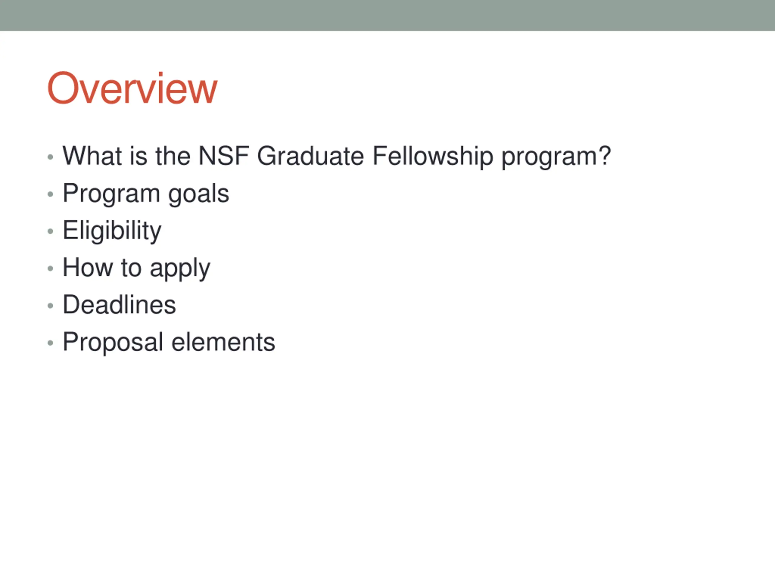 Overview What is the NSF Graduate Fellowship program? Program goals Eligibility How to apply Deadlines Proposal elements