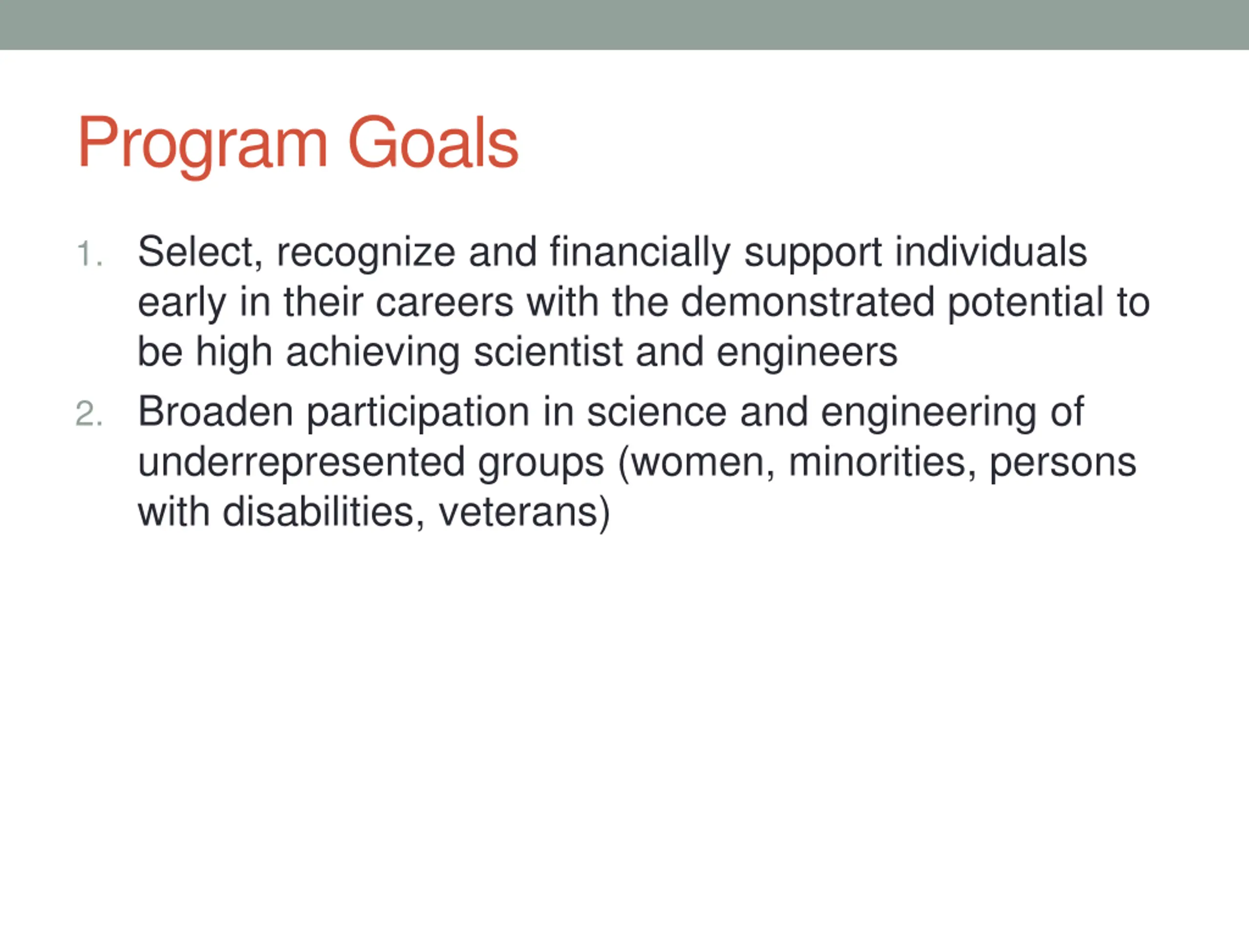 Program Goals 1. Select, recognize and financially support individuals early in their careers with the demonstrated potential to be high achieving scientist and engineers 2. Broaden participation in science and engineering of underrepresented groups (women, minorities, persons with disabilities, veterans)