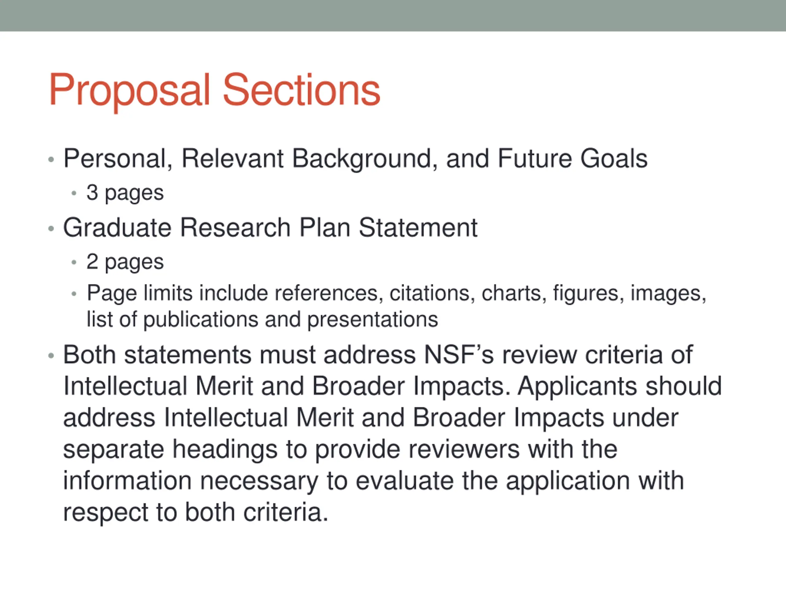 Proposal Sections Personal, Relevant Background, and Future Goals 3 pages Graduate Research Plan Statement 2 pages Page limits include references, citations, charts, figures, images, list of publications and presentations Both statements must address NSF s review criteria of Intellectual Merit and Broader Impacts. Applicants should address Intellectual Merit and Broader Impacts under separate headings to provide reviewers with the information necessary to evaluate the application with respect to both criteria.
