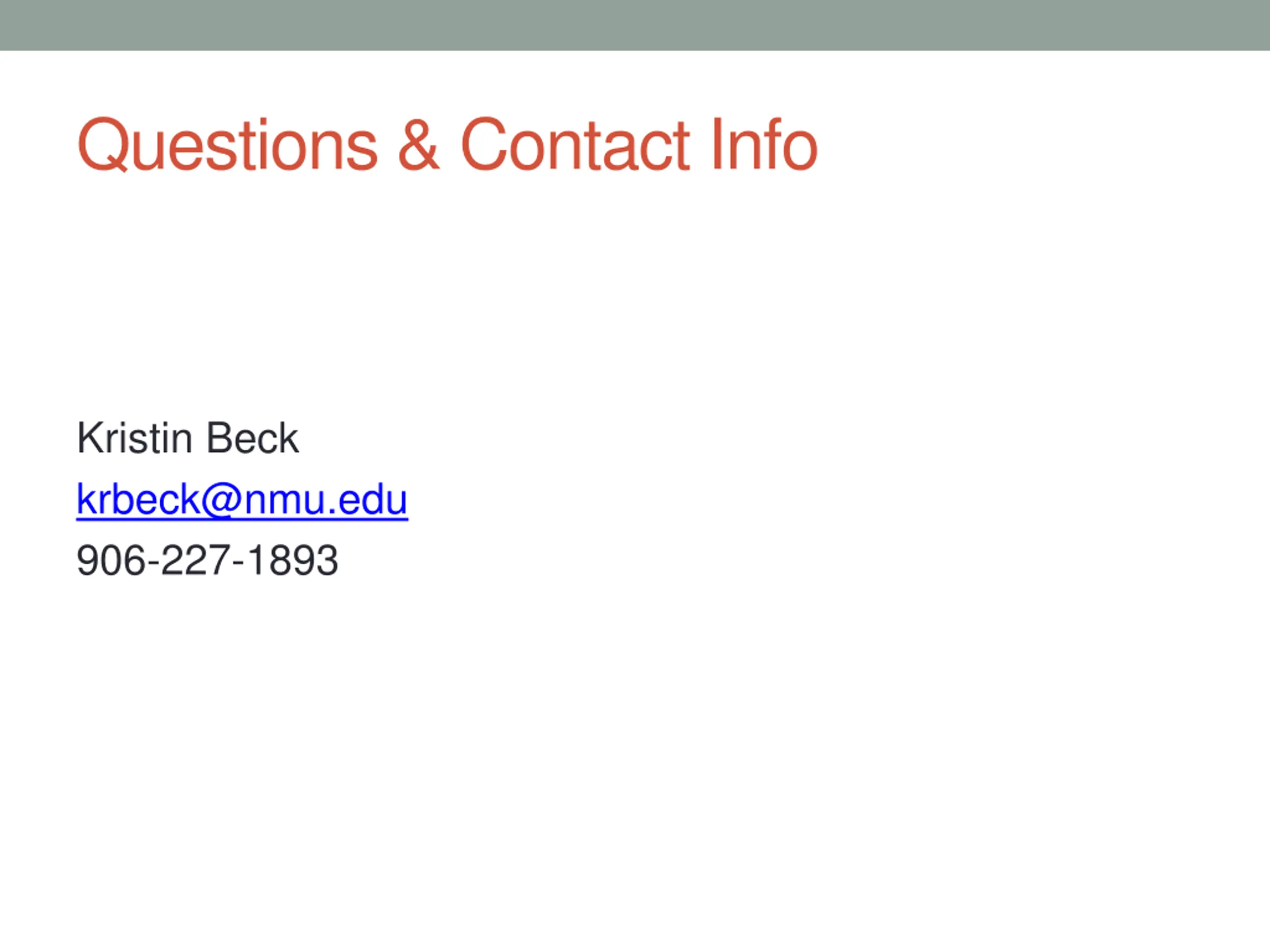 Questions & Contact Info Kristin Beck krbeck@nmu.edu 906-227-1893
