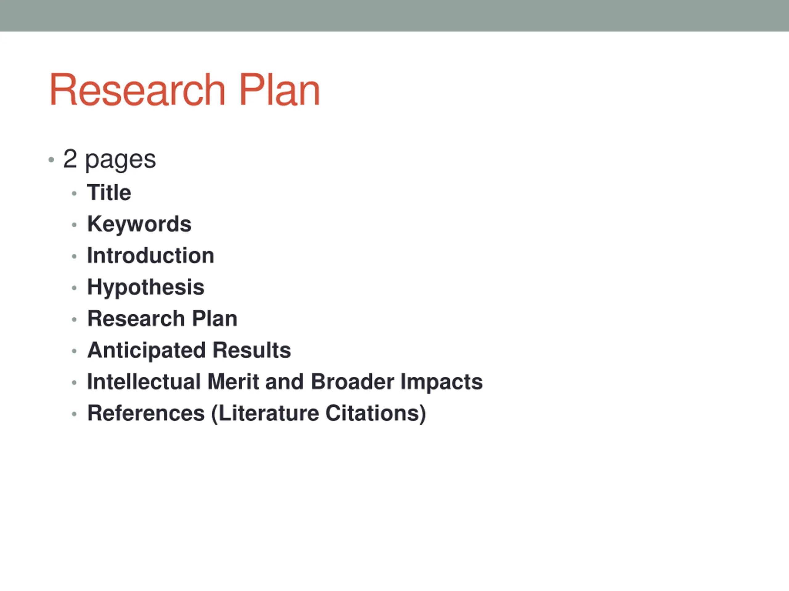 Research Plan 2 pages Title Keywords Introduction Hypothesis Research Plan Anticipated Results Intellectual Merit and Broader Impacts References (Literature Citations)