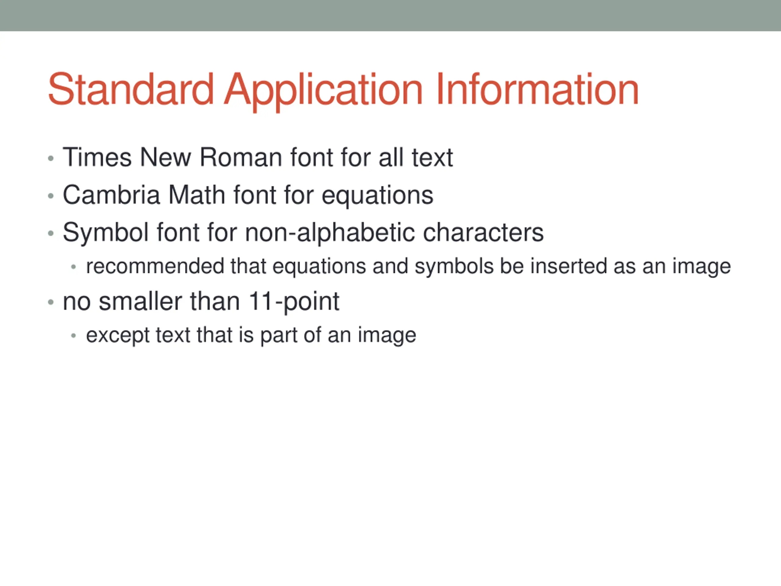 Standard Application Information Times New Roman font for all text Cambria Math font for equations Symbol font for non-alphabetic characters recommended that equations and symbols be inserted as an image no smaller than 11-point except text that is part of an image