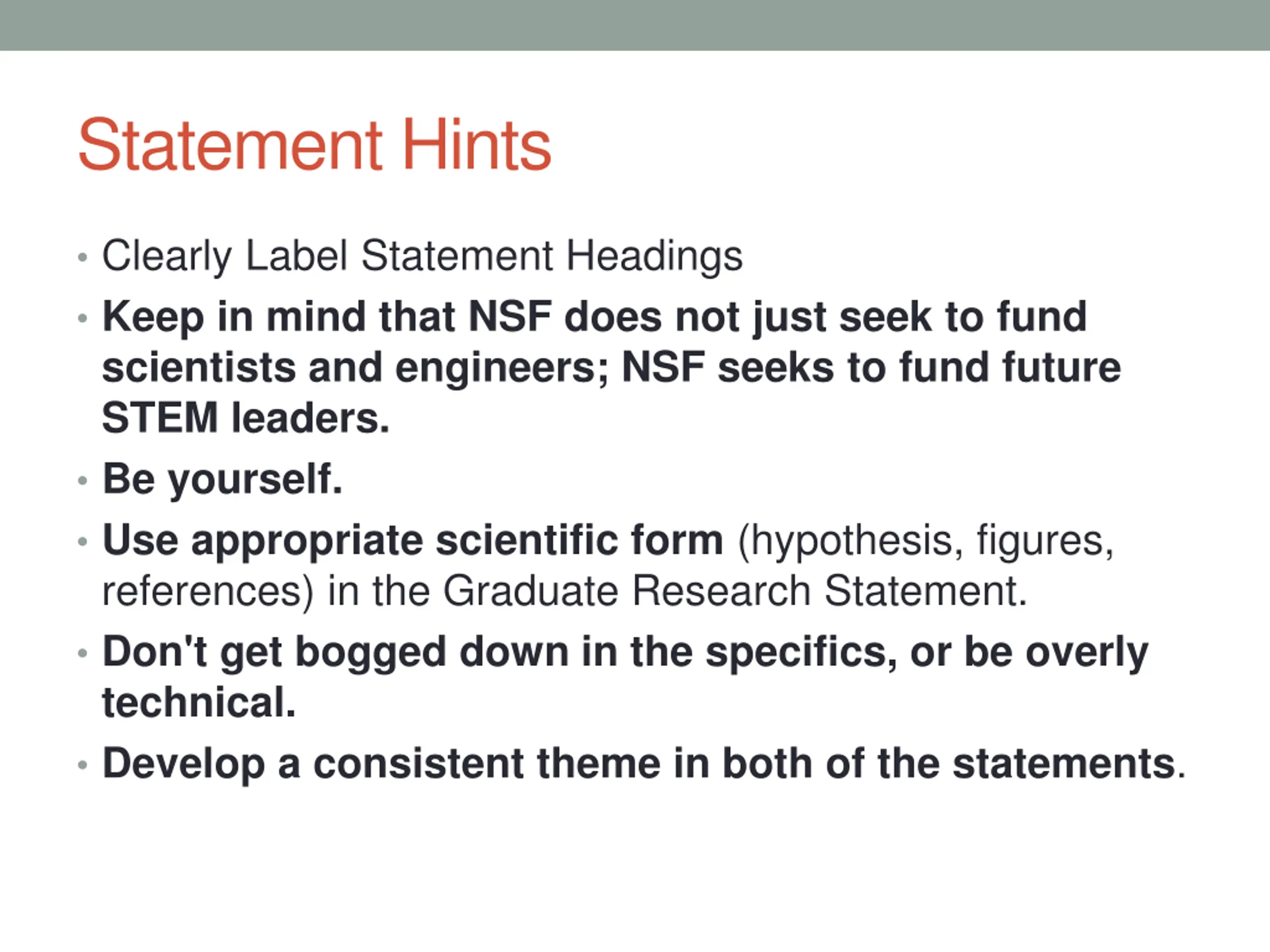 Statement Hints Clearly Label Statement Headings Keep in mind that NSF does not just seek to fund scientists and engineers; NSF seeks to fund future STEM leaders. Be yourself. Use appropriate scientific form (hypothesis, figures, references) in the Graduate Research Statement. Don't get bogged down in the specifics, or be overly technical. Develop a consistent theme in both of the statements.