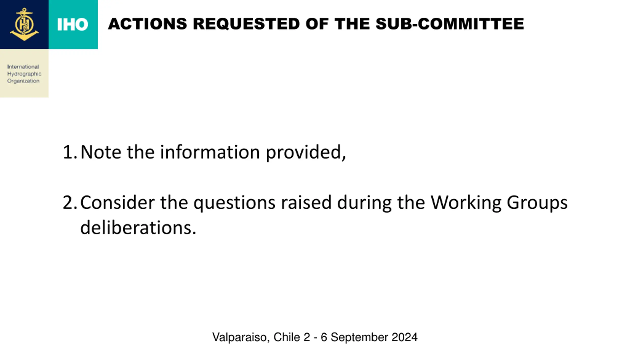 ACTIONS REQUESTED OF THE SUB-COMMITTEE 1.Note the information provided, 2.Consider the questions raised during the Working Groups deliberations. Valparaiso, Chile 2 - 6 September 2024