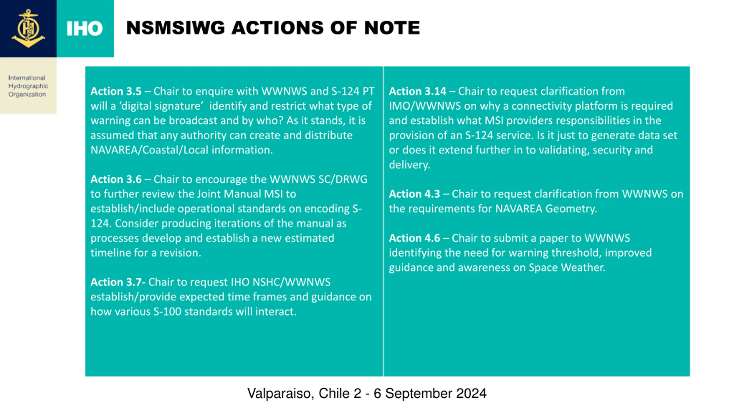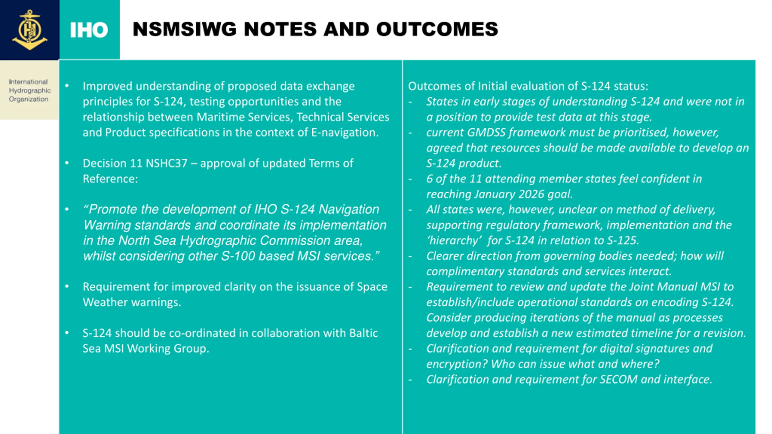 NSMSIWG NOTES AND OUTCOMES Improved understanding of proposed data exchange principles for S-124, testing opportunities and the relationship between Maritime Services, Technical Services and Product specifications in the context of E-navigation. Outcomes of Initial evaluation of S-124 status: - States in early stages of understanding S-124 and were not in a position to provide test data at this stage. - current GMDSS framework must be prioritised, however, agreed that resources should be made available to develop an S-124 product. - 6 of the 11 attending member states feel confident in reaching January 2026 goal. - All states were, however, unclear on method of delivery, supporting regulatory framework, implementation and the hierarchy for S-124 in relation to S-125. - Clearer direction from governing bodies needed; how will complimentary standards and services interact. - Requirement to review and update the Joint Manual MSI to establish/include operational standards on encoding S-124. Consider producing iterations of the manual as processes develop and establish a new estimated timeline for a revision. - Clarification and requirement for digital signatures and encryption? Who can issue what and where? - Clarification and requirement for SECOM and interface. Decision 11 NSHC37 approval of updated Terms of Reference: Promote the development of IHO S-124 Navigation Warning standards and coordinate its implementation in the North Sea Hydrographic Commission area, whilst considering other S-100 based MSI services. Requirement for improved clarity on the issuance of Space Weather warnings. S-124 should be co-ordinated in collaboration with Baltic Sea MSI Working Group. Valparaiso, Chile 2 - 6 September 2024