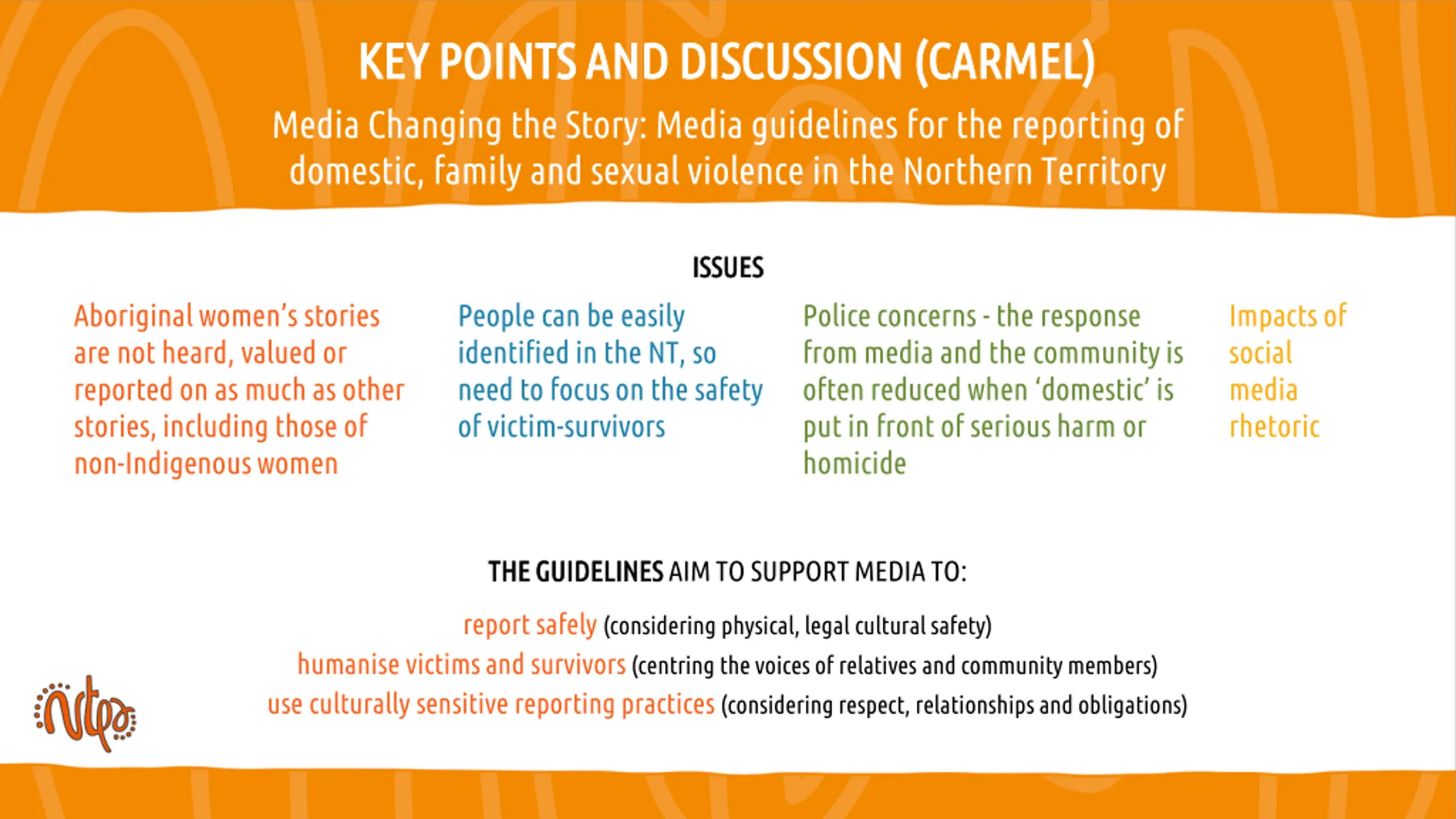 KEY POINTS AND DISCUSSION (CARMEL) KEY POINTS AND DISCUSSION (CARMEL) Media Changing the Story: Media guidelines for the reporting of domestic, family and sexual violence in the Northern Territory ISSUES ISSUES Aboriginal women s stories are not heard, valued or reported on as much as other stories, including those of non-Indigenous women People can be easily identified in the NT, so need to focus on the safety of victim-survivors Police concerns -the response from media and the community is often reduced when domestic is put in front of serious harm or homicide Impacts of social media rhetoric THE GUIDELINES THE GUIDELINESAIM TO SUPPORT MEDIA TO: report safely (considering physical, legal cultural safety) humanise victims and survivors(centring the voices of relatives and community members) use culturally sensitive reporting practices (considering respect, relationships and obligations)