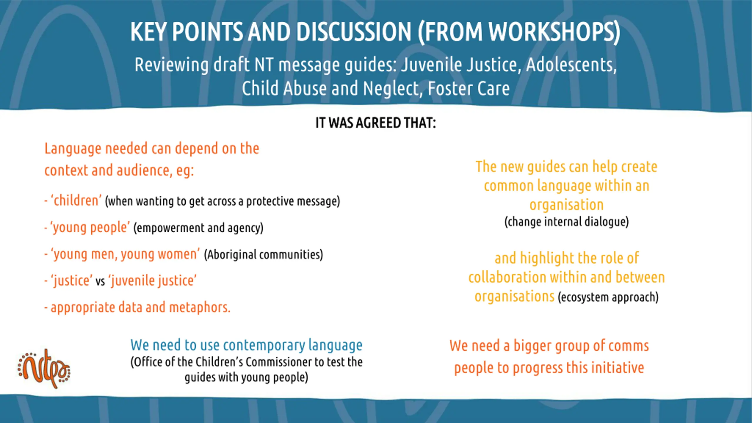 KEY POINTS AND DISCUSSION (FROM WORKSHOPS) KEY POINTS AND DISCUSSION (FROM WORKSHOPS) Reviewing draft NT message guides: Juvenile Justice, Adolescents, Child Abuse and Neglect, Foster Care IT WAS AGREED THAT: IT WAS AGREED THAT: Language needed can depend on the context and audience, eg: The new guides can help create common language within an organisation (change internal dialogue) - children (when wanting to get across a protective message) - young people (empowerment and agency) - young men, young women (Aboriginal communities) and highlight the role of collaboration within and between organisations (ecosystem approach) - justice vs juvenile justice -appropriate data and metaphors. We need to use contemporary language (Office of the Children s Commissioner to test the guides with young people) We need a bigger group of comms people to progress this initiative
