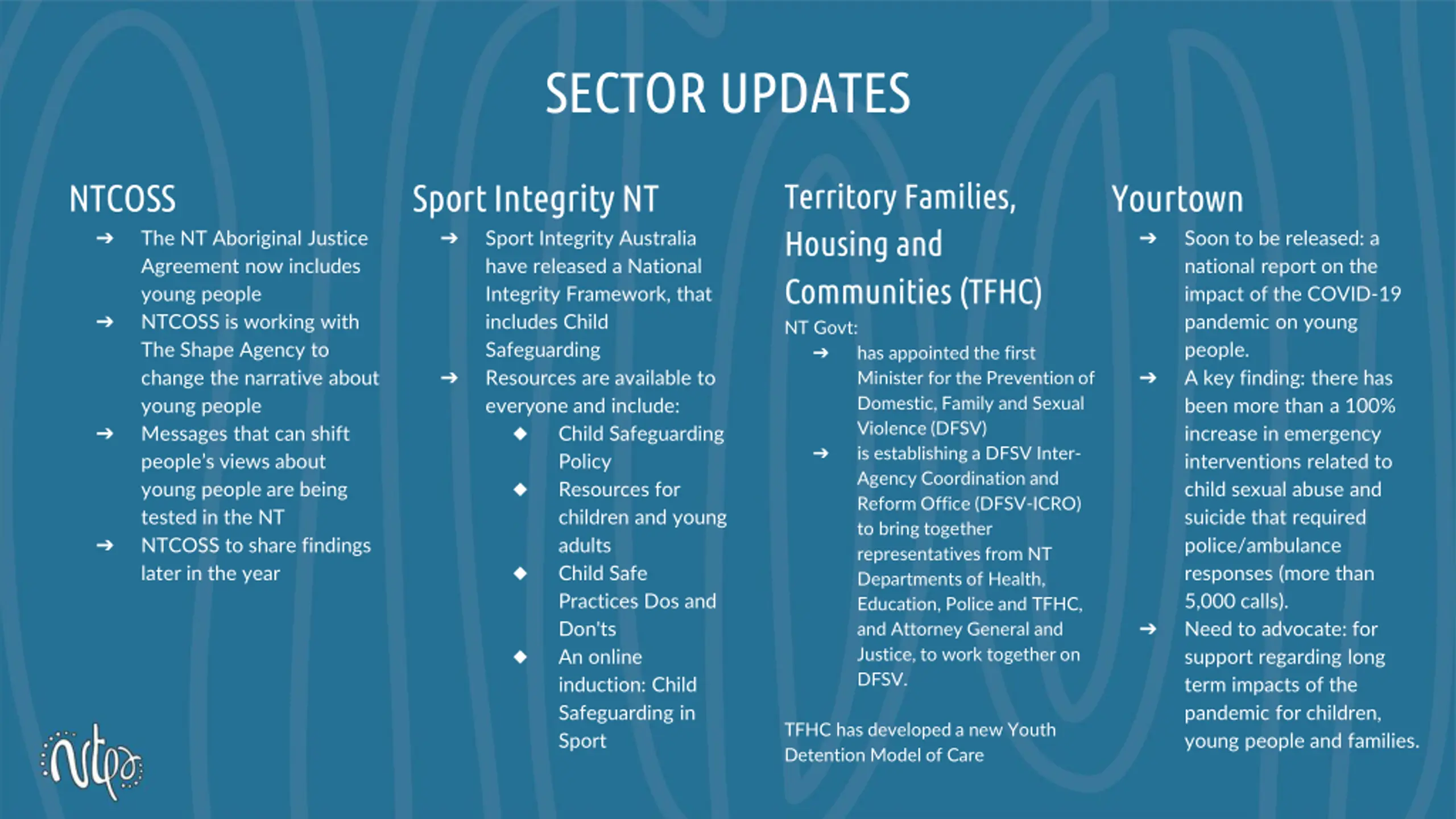 SECTOR UPDATES Territory Families, Housing and Communities (TFHC) NT Govt: has appointed the first Minister for the Prevention of Domestic, Family and Sexual Violence (DFSV) is establishing a DFSV Inter- Agency Coordination and Reform Office (DFSV-ICRO) to bring together representatives from NT Departments of Health, Education, Police and TFHC, and Attorney General and Justice, to work together on DFSV. NTCOSS Sport Integrity NT Sport Integrity Australia have released a National Integrity Framework, that includes Child Safeguarding Resources are available to everyone and include: Child Safeguarding Policy Resources for children and young adults Child Safe Practices Dos and Don'ts An online induction: Child Safeguarding in Sport Yourtown The NT Aboriginal Justice Agreement now includes young people NTCOSS is working with The Shape Agency to change the narrative about young people Messages that can shift people s views about young people are being tested in the NT NTCOSS to share findings later in the year Soon to be released: a national report on the impact of the COVID-19 pandemic on young people. A key finding: there has been more than a 100% increase in emergency interventions related to child sexual abuse and suicide that required police/ambulance responses (more than 5,000 calls). Need to advocate: for support regarding long term impacts of the pandemic for children, young people and families. TFHC has developed a new Youth Detention Model of Care