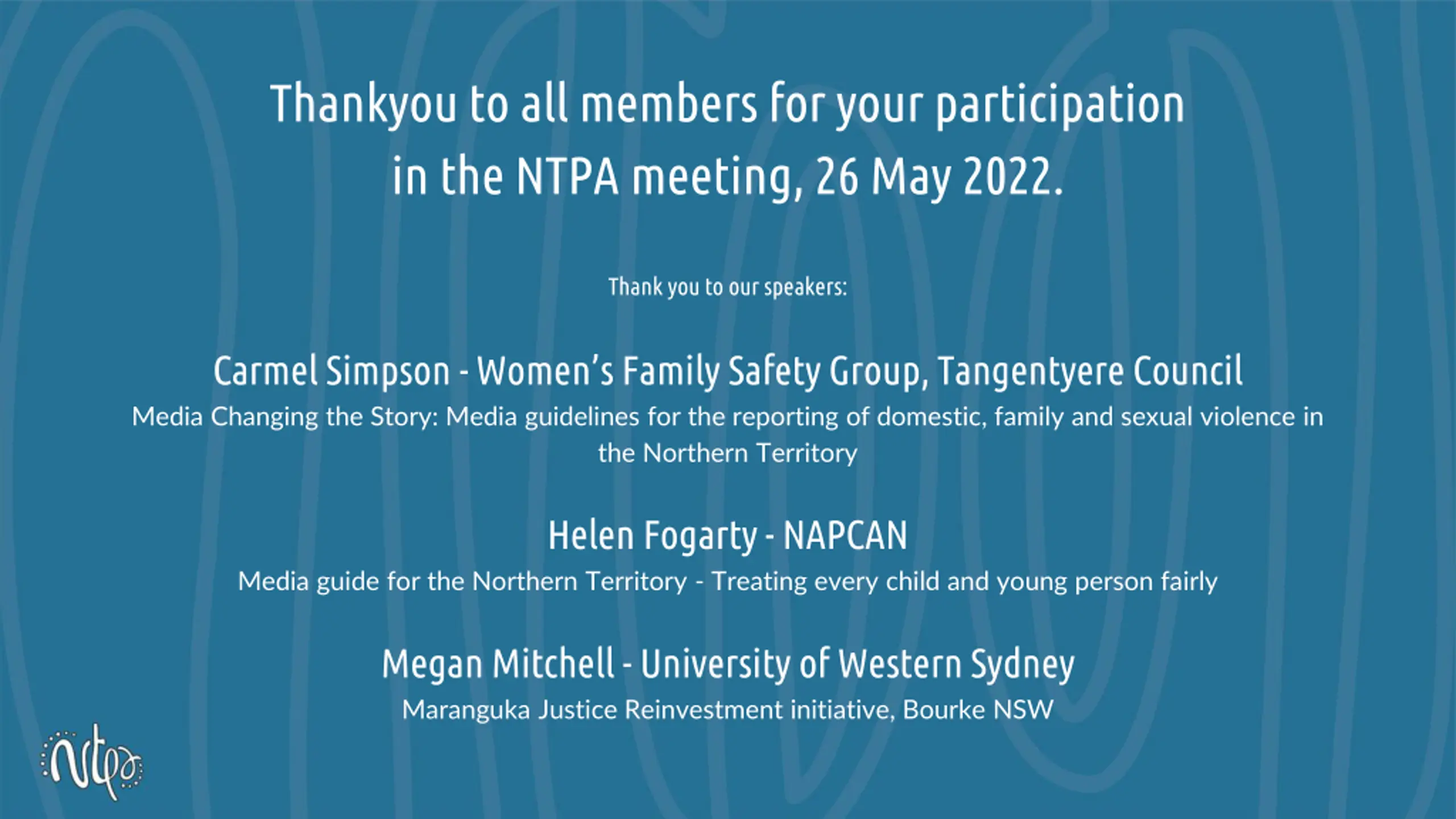 Thankyou to all members for your participation in the NTPA meeting, 26 May 2022. Thank you to our speakers: Carmel Simpson -Women s Family Safety Group, Tangentyere Council Media Changing the Story: Media guidelines for the reporting of domestic, family and sexual violence in the Northern Territory Helen Fogarty -NAPCAN Media guide for the Northern Territory - Treating every child and young person fairly Megan Mitchell -University of Western Sydney Maranguka Justice Reinvestment initiative, Bourke NSW