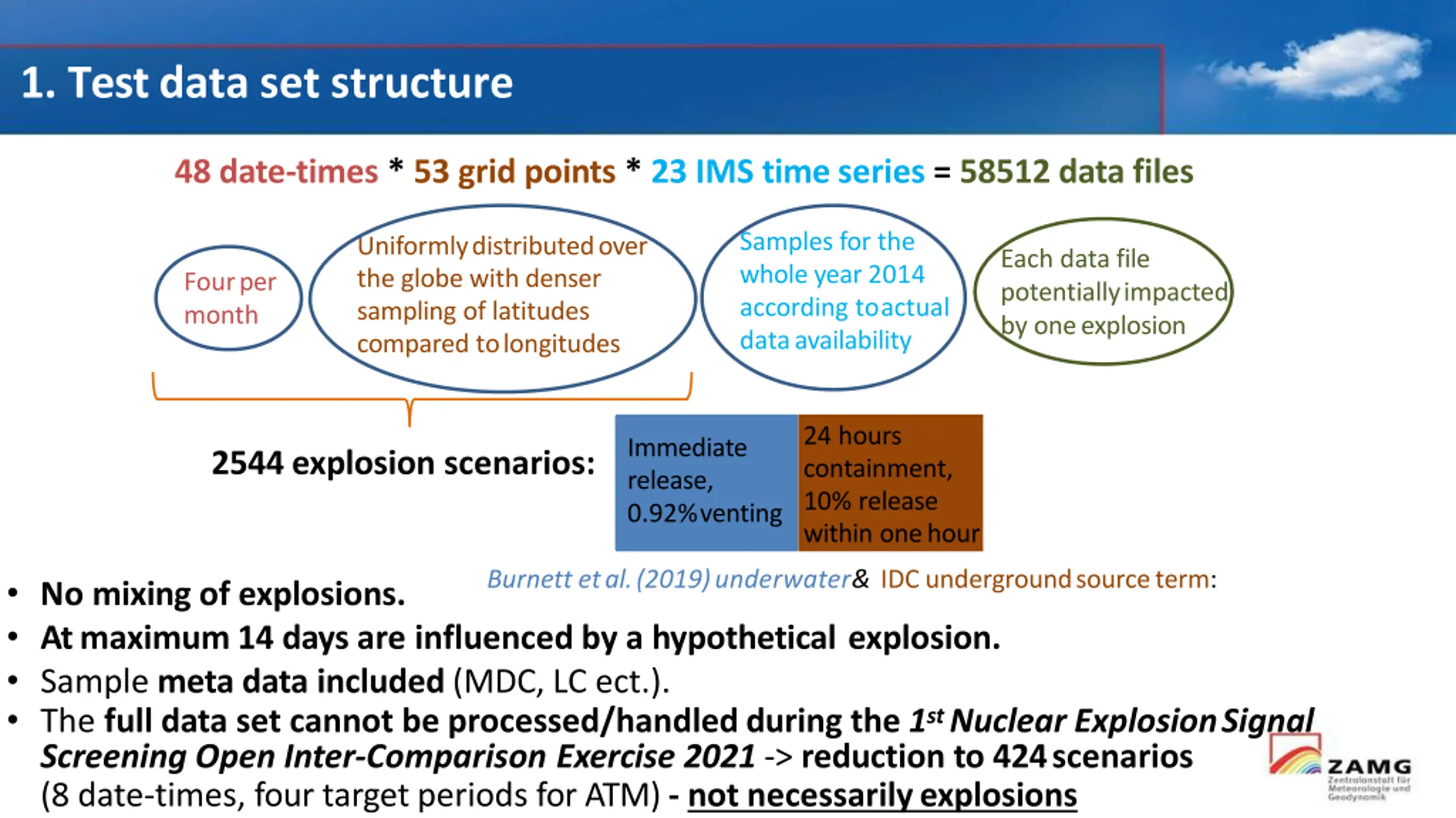 1. Test data set structure 48 date-times * 53 grid points * 23 IMS time series = 58512 data files Samples for the whole year 2014 according toactual dataavailability Uniformlydistributedover the globe with denser sampling of latitudes compared tolongitudes Each data file potentiallyimpacted by oneexplosion Fourper month 24 hours containment, 10% release within onehour Immediate release, 0.92%venting 2544 explosion scenarios: Burnett etal.(2019)underwater& IDC undergroundsourceterm: No mixing of explosions. At maximum 14 days are influenced by a hypothetical explosion. Sample meta data included (MDC, LC ect.). The full data set cannot be processed/handled during the 1st Nuclear ExplosionSignal Screening Open Inter-Comparison Exercise 2021 -> reduction to 424scenarios (8 date-times, four target periods for ATM) - not necessarilyexplosions