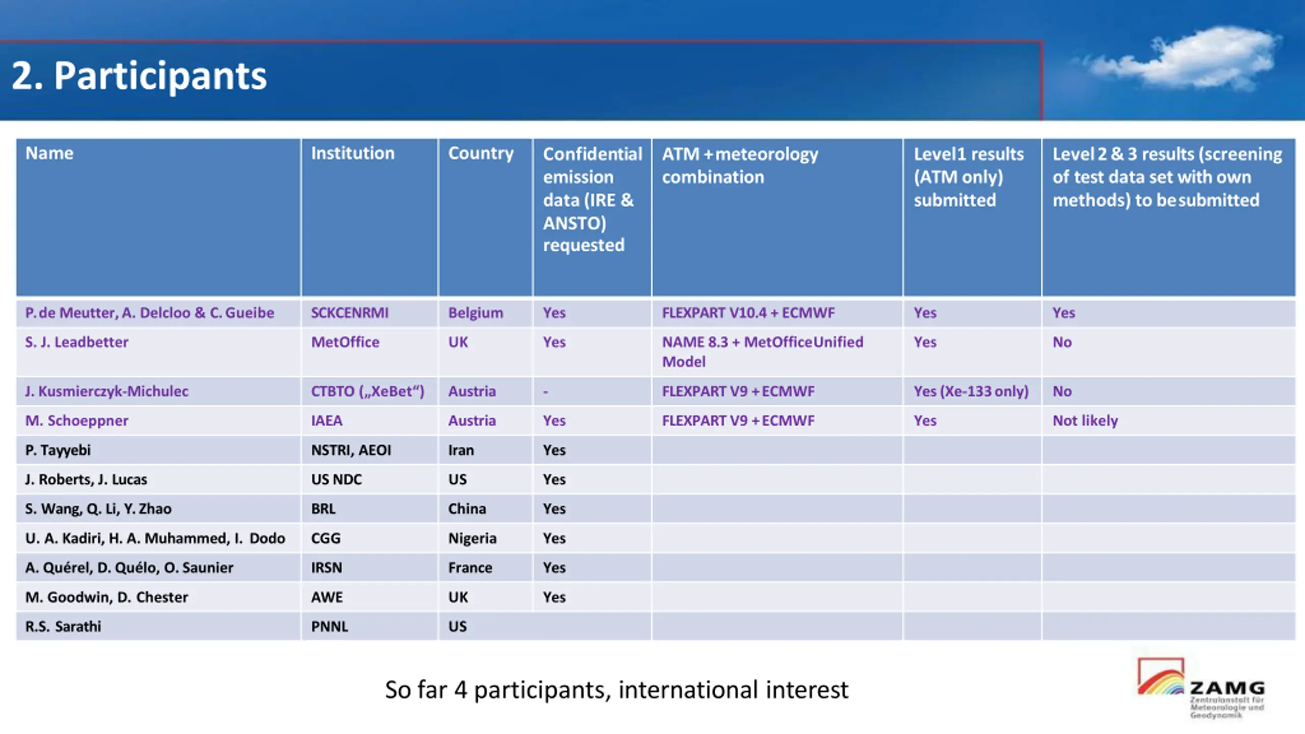 2. Participants Name Institution Country Confidential emission data (IRE & ANSTO) requested ATM +meteorology combination Level1 results (ATM only) submitted Level2&3 results(screening of test data set with own methods) to besubmitted P. de Meutter, A. Delcloo & C.Gueibe SCKCENRMI Belgium Yes FLEXPART V10.4 + ECMWF Yes Yes S. J. Leadbetter MetOffice UK Yes NAME 8.3 + MetOfficeUnified Model Yes No J.Kusmierczyk-Michulec CTBTO ( XeBet ) Austria - FLEXPART V9 +ECMWF Yes (Xe-133only) No M. Schoeppner IAEA Austria Yes FLEXPART V9 +ECMWF Yes Not likely P. Tayyebi NSTRI, AEOI Iran Yes J. Roberts, J. Lucas USNDC US Yes S. Wang, Q. Li, Y.Zhao BRL China Yes U. A. Kadiri, H. A. Muhammed, I. Dodo CGG Nigeria Yes A. Qu rel, D. Qu lo, O.Saunier IRSN France Yes M. Goodwin, D. Chester AWE UK Yes R.S. Sarathi PNNL US So far 4 participants, international interest