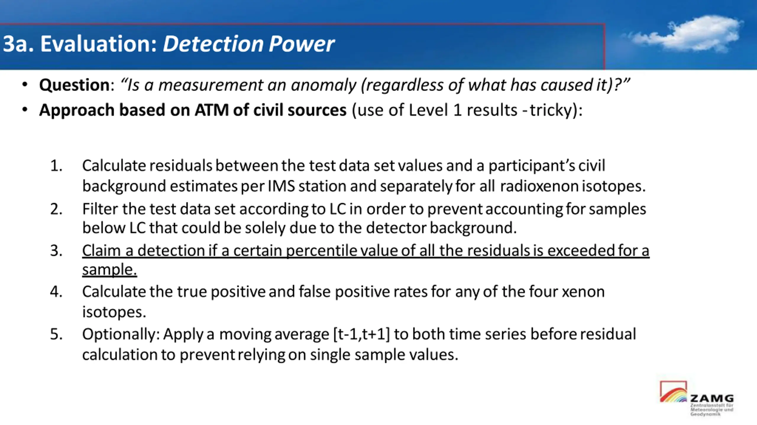 3a. Evaluation: DetectionPower Question: Is a measurement an anomaly (regardless of what has causedit)? Approach based on ATM of civil sources (use of Level 1 results -tricky): 1. Calculateresidualsbetweenthe testdatasetvaluesandaparticipant scivil backgroundestimatesperIMSstationandseparatelyfor all radioxenonisotopes. Filter thetestdatasetaccordingtoLCin ordertopreventaccountingforsamples belowLCthatcouldbesolelydueto the detectorbackground. Claim a detectionif acertainpercentilevalueofall the residualsis exceededfora sample. Calculatethe truepositiveandfalse positiveratesfor anyof thefourxenon isotopes. Optionally:Applya movingaverage[t-1,t+1]tobothtime series beforeresidual calculationto preventrelyingonsingle sample values. 2. 3. 4. 5.