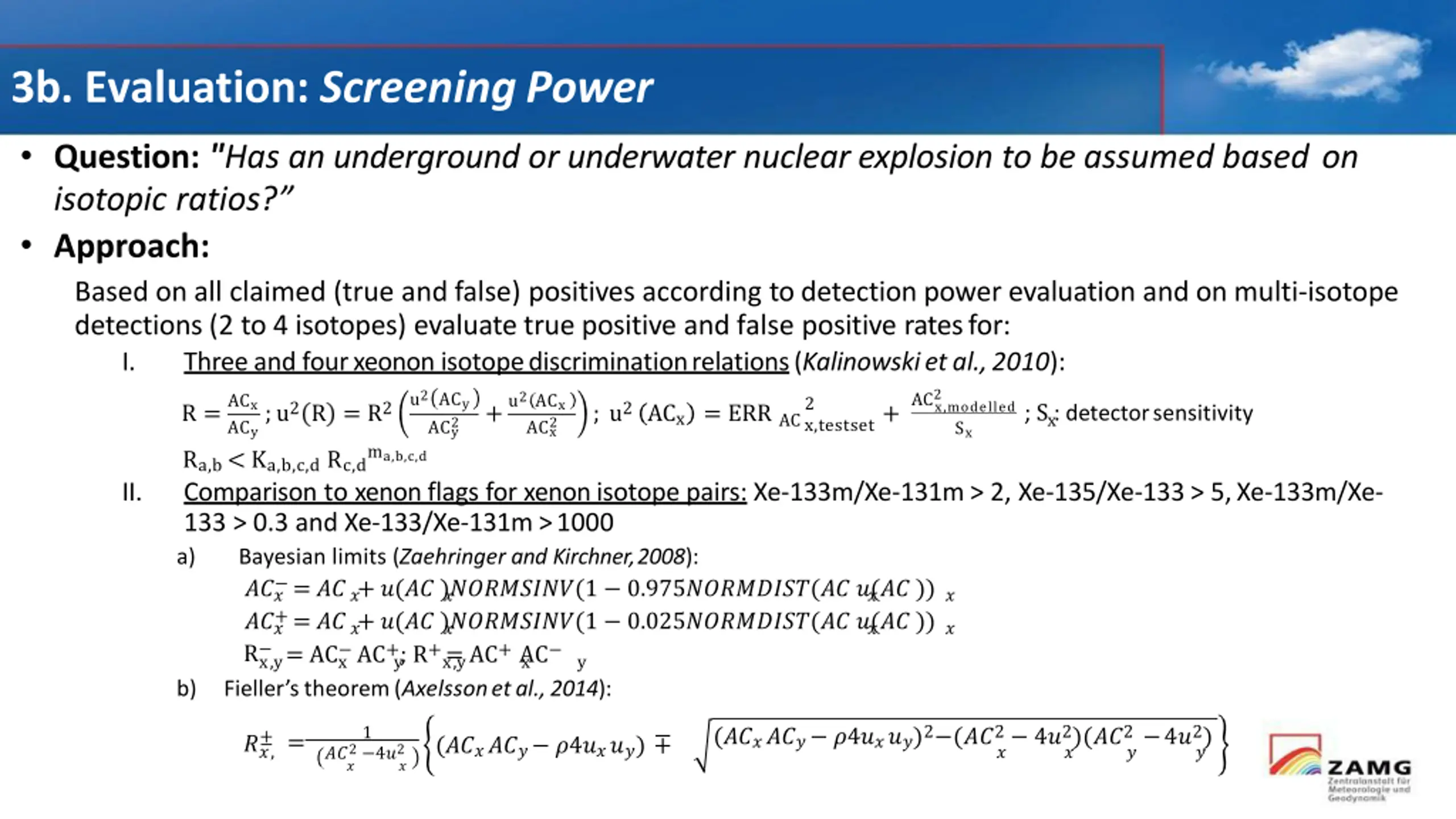 3b. Evaluation: ScreeningPower Question: "Has an underground or underwater nuclear explosion to be assumed based on isotopic ratios? Approach: Based on all claimed (true and false) positives according to detection power evaluation and on multi-isotope detections (2 to 4 isotopes) evaluate true positive and false positive ratesfor: I. Threeand fourxeonon isotopediscriminationrelations(Kalinowskietal.,2010): AC2 u2 ACy u2ACx ACx2 ACx 2 x,testset+ ;u2 R = R2 ; u2 ACx = ERRAC x,modelled Sx ; S : detectorsensitivity R = + x ACy2 ACy Ra,b < Ka,b,c,dRc,dma,b,c,d Comparison to xenon flags for xenon isotope pairs: Xe-133m/Xe-131m > 2, Xe-135/Xe-133 > 5,Xe-133m/Xe- 133 > 0.3 and Xe-133/Xe-131m >1000 a) Bayesian limits (Zaehringer and Kirchner,2008): ?? = ?? + ?(?? )????????(1 0.975????????(?? ?(?? )) ??+ = ?? + ?(?? )????????(1 0.025????????(?? ?(?? )) R x,y x y x,y x y = AC AC+; R+ = AC+AC b) Fieller stheorem(Axelssonetal.,2014): II. ? ? ? ? ? ? ? ? ? ? (?????? ?4????)2 (??2 4?2)(??2 4?2) 1 ? = (?????? ?4????) ??2 4?2 ? ?, ? ? ? ? ?