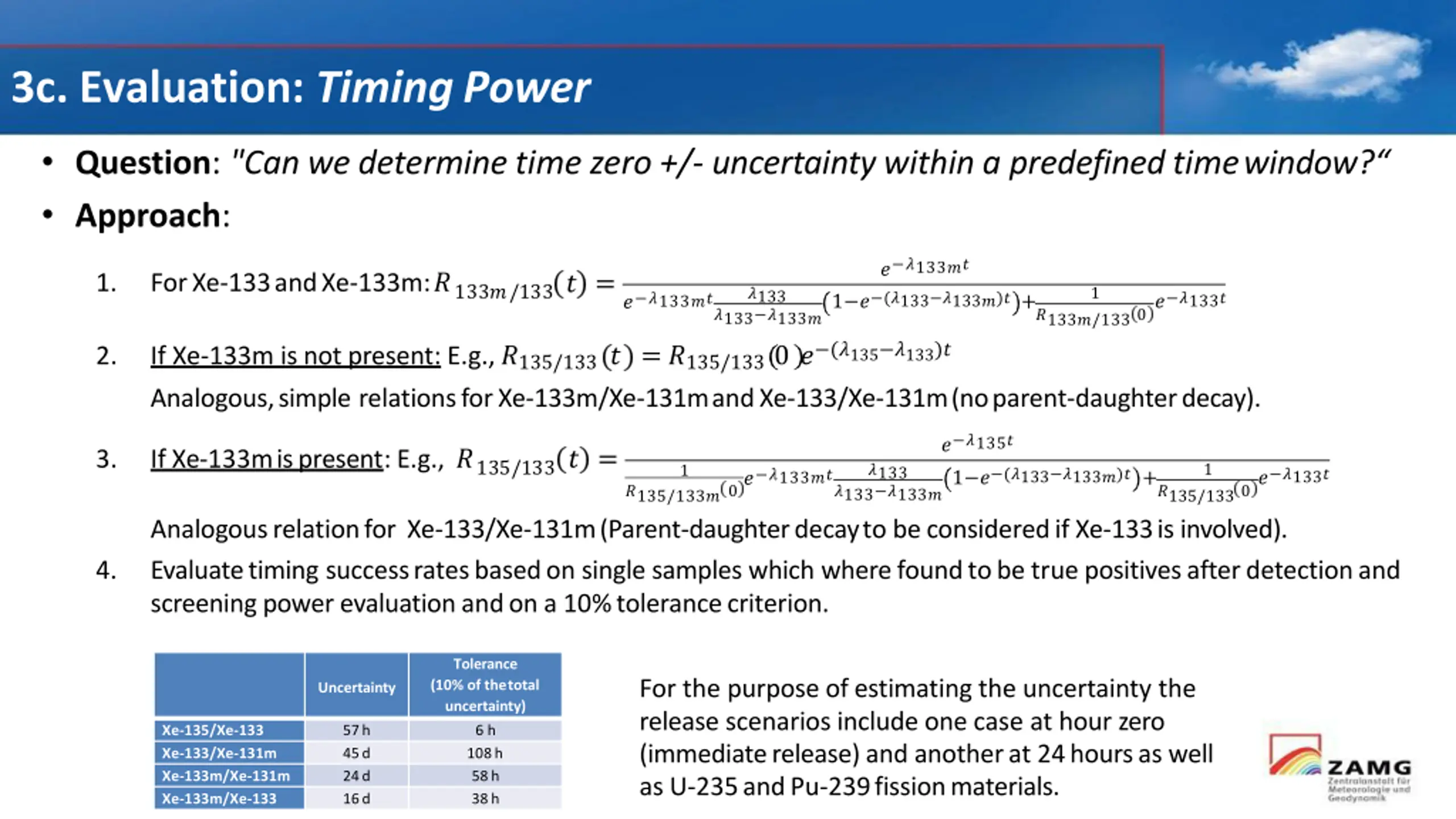 3c. Evaluation: TimingPower Question: "Can we determine time zero +/- uncertainty within a predefined timewindow? Approach: ? ?133?? ForXe-133andXe-133m:?133?/133? = 1. 1 ?133 1 ? (?133 ?133?)?+ ? ?133? ? ?133?? ?133 ?133? ?133?/1330 If Xe-133m is not present: E.g.,?135/133 ? = ?135/133 0 ? (?135 ?133)? Analogous,simple relationsforXe-133m/Xe-131mandXe-133/Xe-131m(noparent-daughterdecay). 2. ? ?135? 1 ? (?133 ?133?)?+ If Xe-133mispresent: E.g., ? ? = 3. 135/133 1 ?133 1 ? ?133? ? ?133?? ?135/133?0 ?133 ?133? ?135/1330 Analogousrelationfor Xe-133/Xe-131m(Parent-daughterdecayto beconsideredif Xe-133is involved). Evaluatetiming successratesbasedon single samples which wherefoundtobe true positivesafterdetectionand screeningpower evaluationandon a 10%tolerancecriterion. 4. Tolerance (10% of thetotal uncertainty) For the purpose of estimating the uncertainty the release scenarios include one case at hour zero (immediaterelease) and anotherat 24hoursas well asU-235andPu-239fissionmaterials. Uncertainty Xe-135/Xe-133 Xe-133/Xe-131m Xe-133m/Xe-131m Xe-133m/Xe-133 57h 45d 24d 16d 6 h 108h 58h 38h