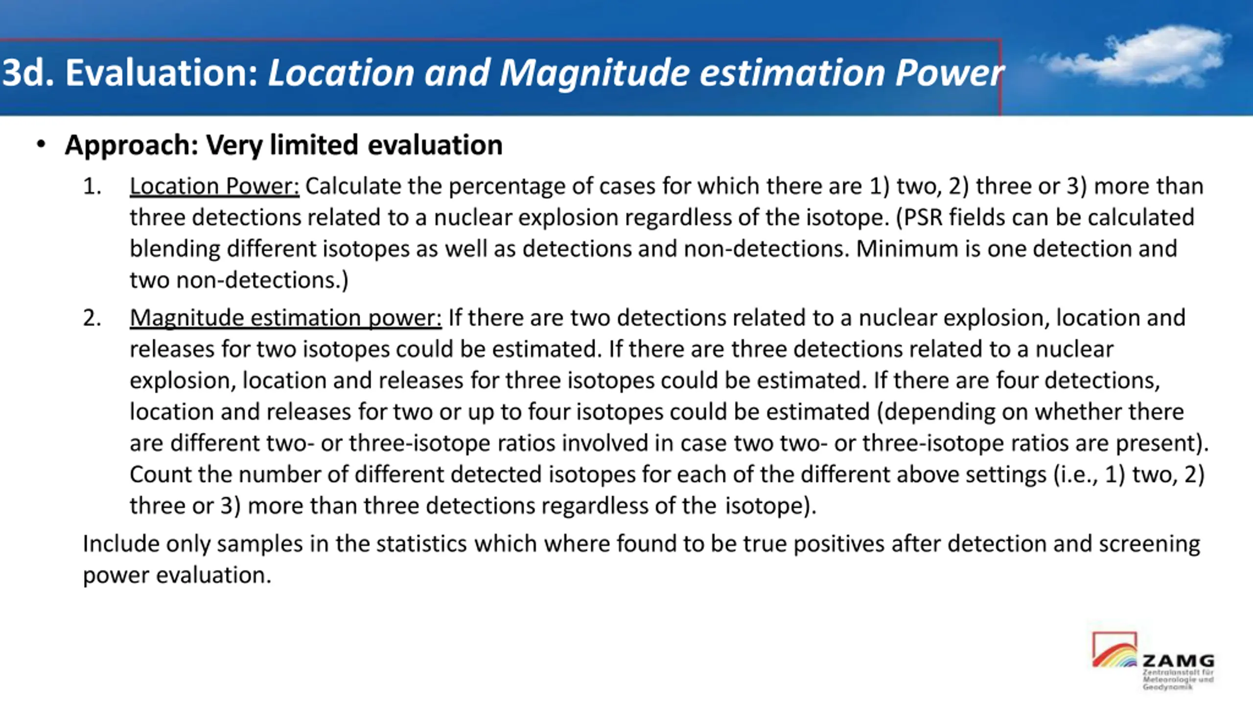 3d. Evaluation: Location and Magnitude estimation Power Approach: Very limited evaluation 1. Location Power: Calculate the percentage of cases for which there are 1) two, 2) three or 3) more than three detections related to a nuclear explosion regardless of the isotope. (PSR fields can be calculated blending different isotopes as well as detections and non-detections. Minimum is one detection and two non-detections.) 2. Magnitude estimation power: If there are two detections related to a nuclear explosion, location and releases for two isotopes could be estimated. If there are three detections related to a nuclear explosion, location and releases for three isotopes could be estimated. If there are four detections, location and releases for two or up to four isotopes could be estimated (depending on whether there are different two- or three-isotope ratios involved in case two two- or three-isotope ratios are present). Count the number of different detected isotopes for each of the different above settings (i.e., 1) two, 2) three or 3) more than three detections regardless of the isotope). Include only samples in the statistics which where found to be true positives after detection and screening power evaluation.