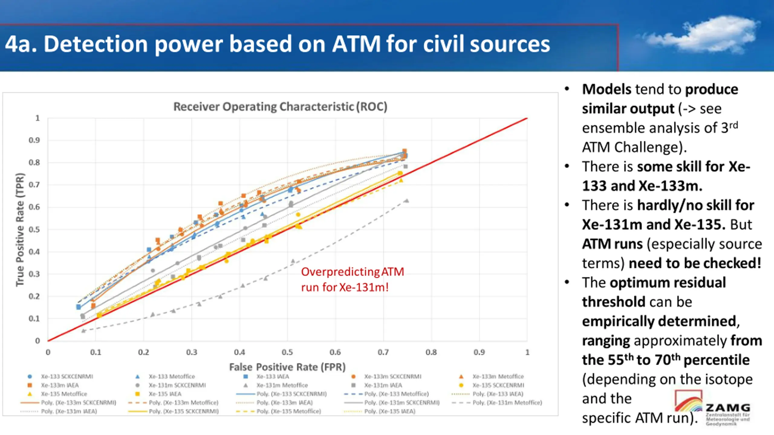 4a. Detection power based on ATM for civilsources Models tend to produce similar output (-> see ensemble analysis of 3rd ATM Challenge). There is some skill for Xe- 133 andXe-133m. There is hardly/no skill for Xe-131m and Xe-135. But ATM runs (especially source terms) need to bechecked! The optimum residual threshold can be empirically determined, ranging approximately from the 55th to 70th percentile (depending on the isotope and the specific ATMrun). OverpredictingATM run forXe-131m!