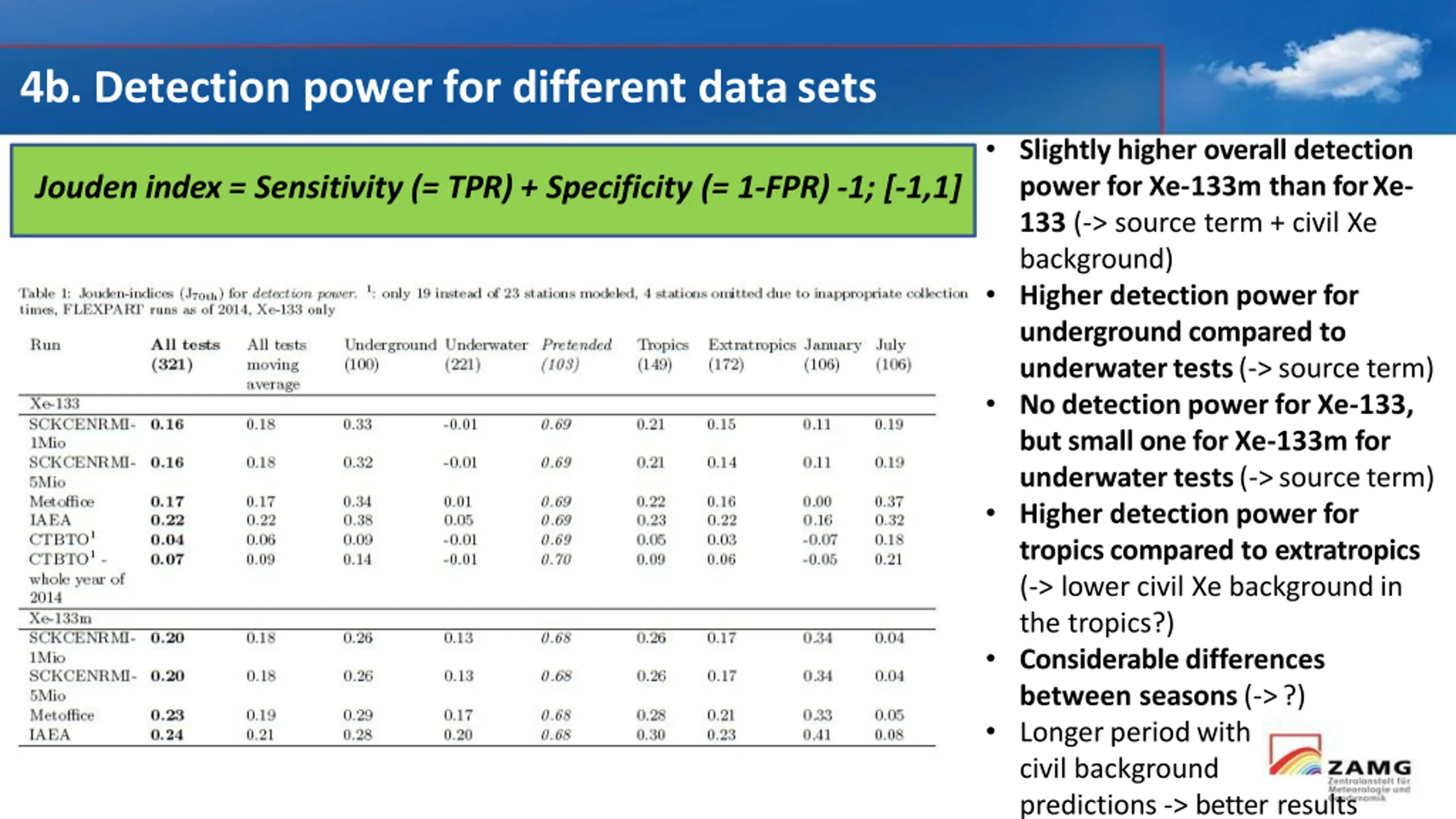 4b. Detection power for different datasets Slightly higher overall detection power for Xe-133m than forXe- 133 (-> source term + civil Xe background) Higher detection power for underground compared to underwatertests(->sourceterm) No detection power for Xe-133, but small one for Xe-133m for underwatertests(->sourceterm) Higher detection power for tropics compared to extratropics (-> lower civil Xe background in the tropics?) Considerable differences between seasons (->?) Longer periodwith civil background predictions -> better results Jouden index = Sensitivity (= TPR) + Specificity (= 1-FPR) -1; [-1,1]