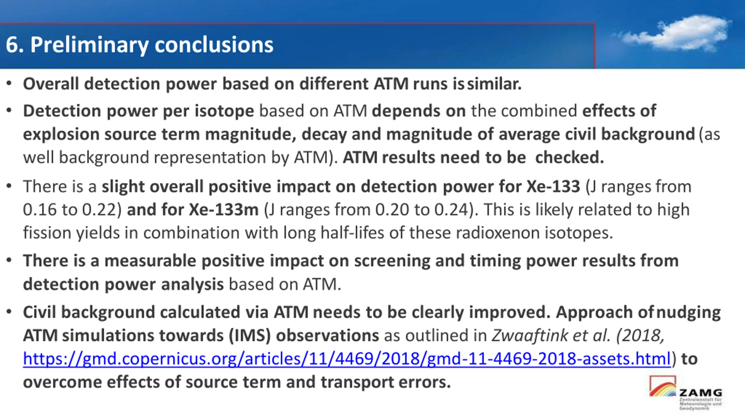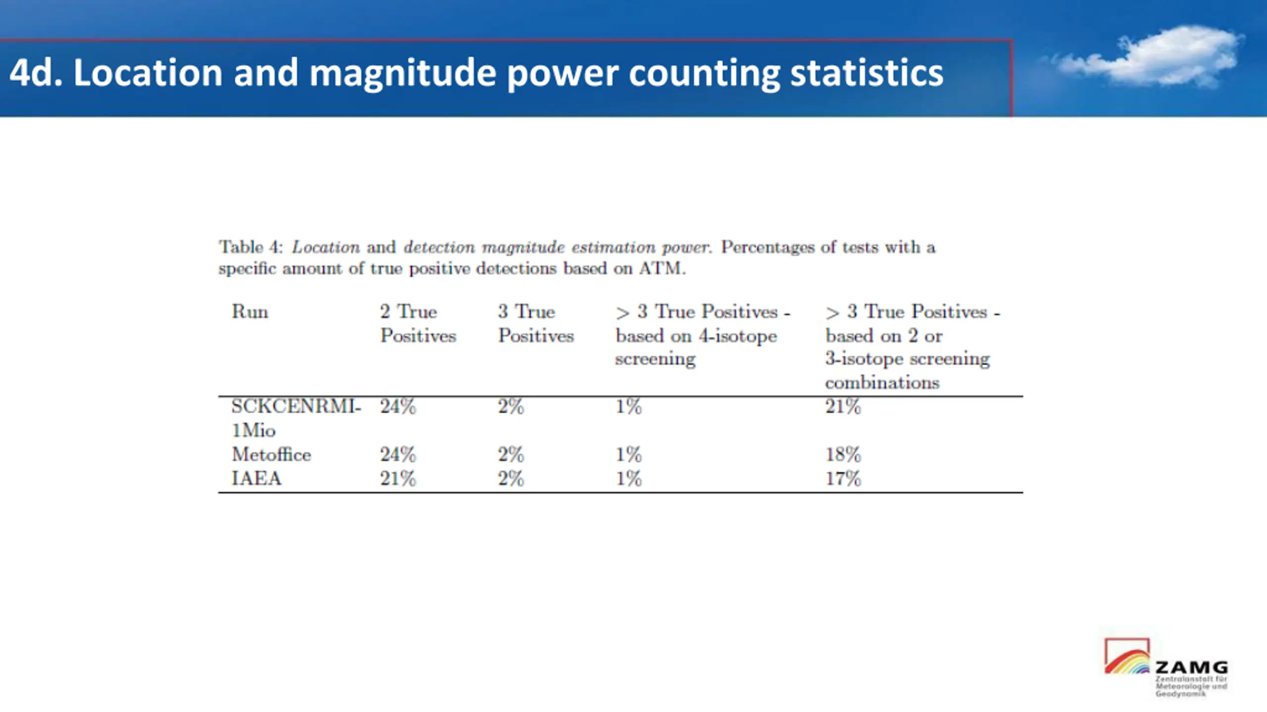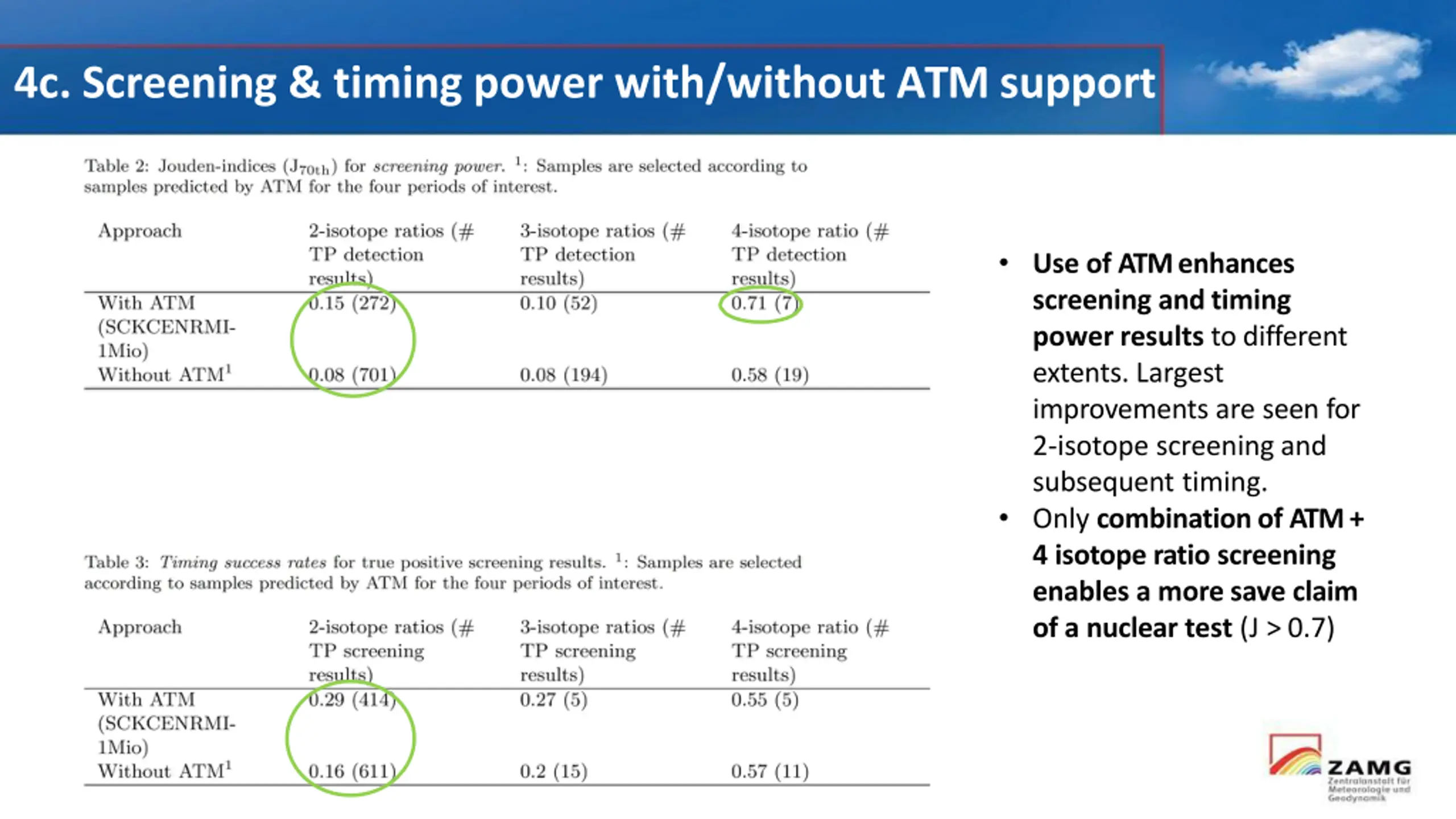 4c. Screening & timing power with/without ATM support Use of ATM enhances screening and timing power results to different extents. Largest improvements are seen for 2-isotope screening and subsequent timing. Only combination of ATM + 4 isotope ratio screening enables a more save claim of a nuclear test (J > 0.7)