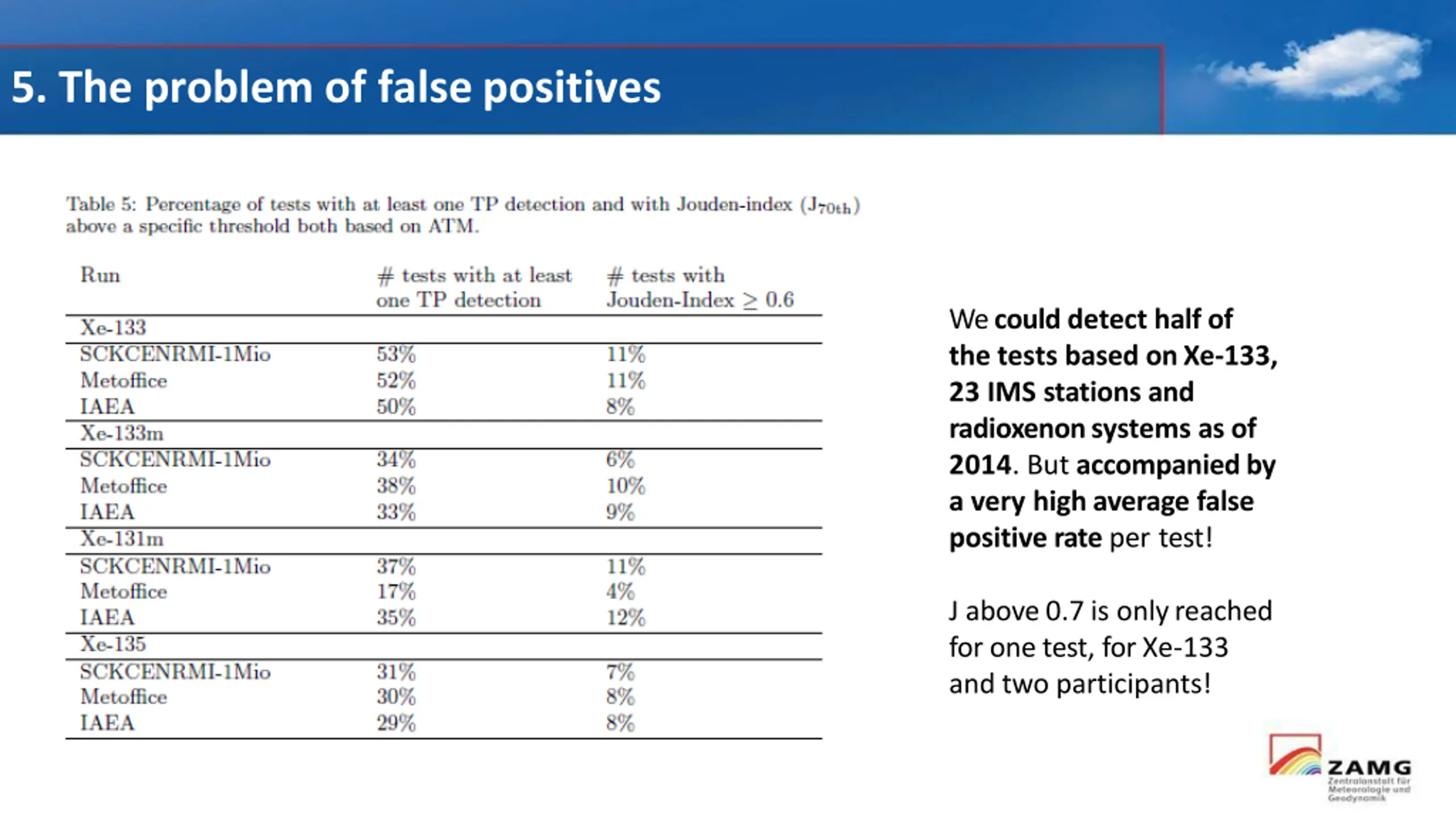 5. The problem of falsepositives We could detect half of the tests based onXe-133, 23 IMS stations and radioxenon systems as of 2014. But accompanied by a very high average false positive rate per test! J above 0.7 is onlyreached for one test, for Xe-133 and two participants!