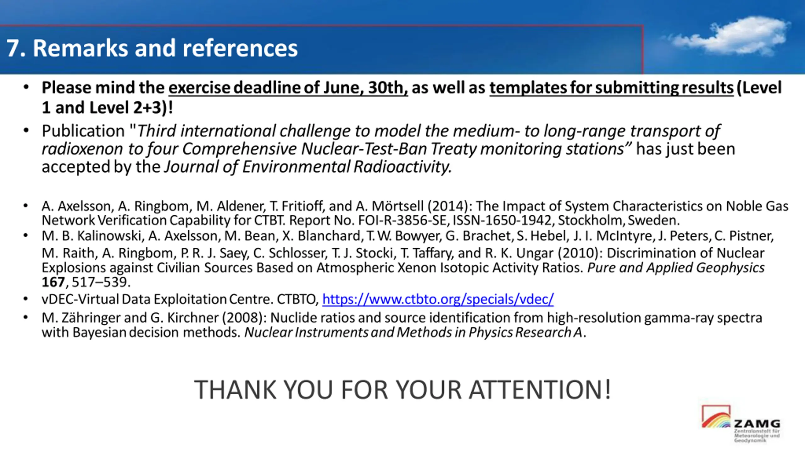 7. Remarks and references Pleasemindtheexercisedeadlineof June,30th,as wellas templatesforsubmittingresults(Level 1 and Level 2+3)! Publication "Third international challenge to model the medium- to long-range transport of radioxenon tofourComprehensive Nuclear-Test-BanTreatymonitoring stations has justbeen acceptedbytheJournalof EnvironmentalRadioactivity. A. Axelsson,A. Ringbom, M. Aldener, T.Fritioff, and A. M rtsell (2014): The Impact of System Characteristics on NobleGas NetworkVerificationCapabilityforCTBT.ReportNo.FOI-R-3856-SE,ISSN-1650-1942,Stockholm,Sweden. M.B.Kalinowski, A. Axelsson,M.Bean,X. Blanchard,T.W.Bowyer,G. Brachet,S.Hebel, J.I. McIntyre,J.Peters,C.Pistner, M. Raith, A. Ringbom, P.R. J. Saey, C. Schlosser, T.J. Stocki, T.Taffary, and R. K. Ungar (2010): Discrimination of Nuclear Explosions against Civilian Sources Based on AtmosphericXenon Isotopic Activity Ratios. Pure and AppliedGeophysics 167,517 539. vDEC-VirtualDataExploitationCentre.CTBTO,https://www.ctbto.org/specials/vdec/ M.Z hringerandG.Kirchner(2008):Nuclideratiosandsourceidentificationfromhigh-resolutiongamma-rayspectra with Bayesiandecision methods. NuclearInstrumentsandMethodsinPhysicsResearchA. THANK YOU FOR YOUR ATTENTION!