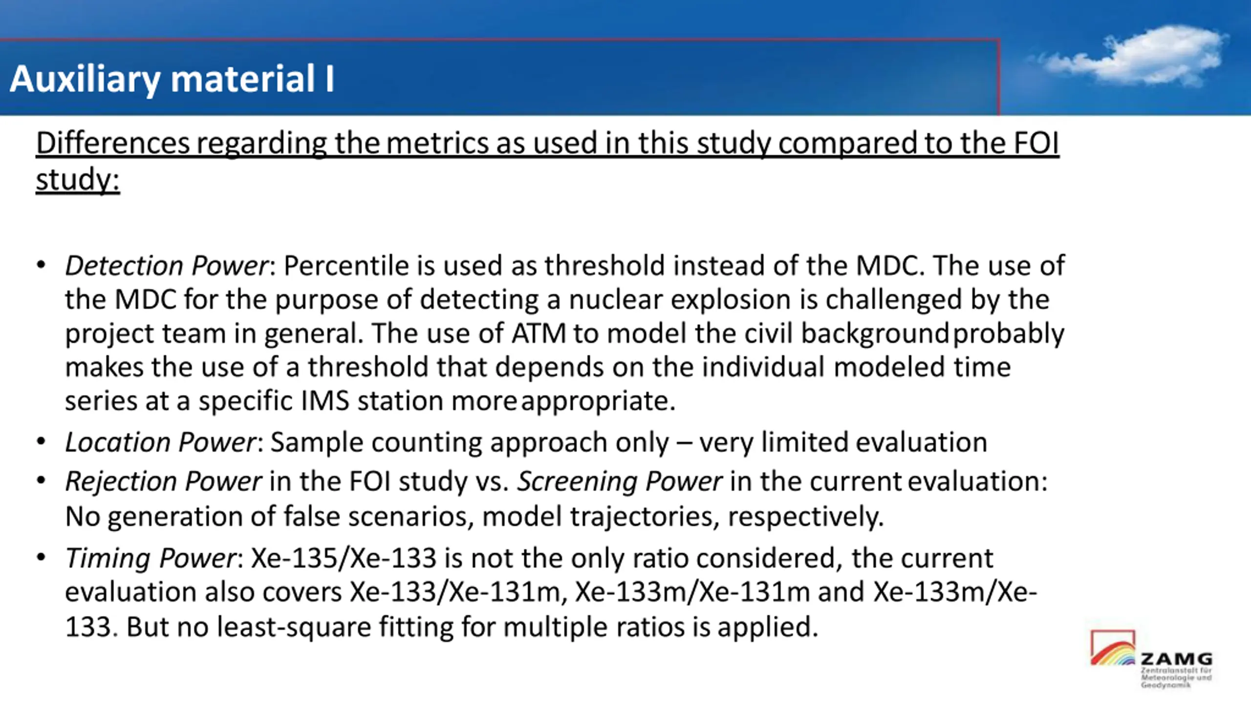 Auxiliary material I Differencesregardingthemetricsasusedin this studycomparedtotheFOI study: Detection Power: Percentile is used as threshold instead of the MDC. The use of the MDC for the purpose of detecting a nuclear explosion is challenged by the project team in general. The use of ATM to model the civil backgroundprobably makes the use of a threshold that depends on the individual modeled time series at a specific IMS station moreappropriate. Location Power: Sample counting approach only very limitedevaluation Rejection Power in the FOI study vs. Screening Power in the currentevaluation: No generation of false scenarios, model trajectories, respectively. Timing Power: Xe-135/Xe-133 is not the only ratio considered, the current evaluation also covers Xe-133/Xe-131m, Xe-133m/Xe-131m and Xe-133m/Xe- 133. But no least-square fitting for multiple ratios isapplied.