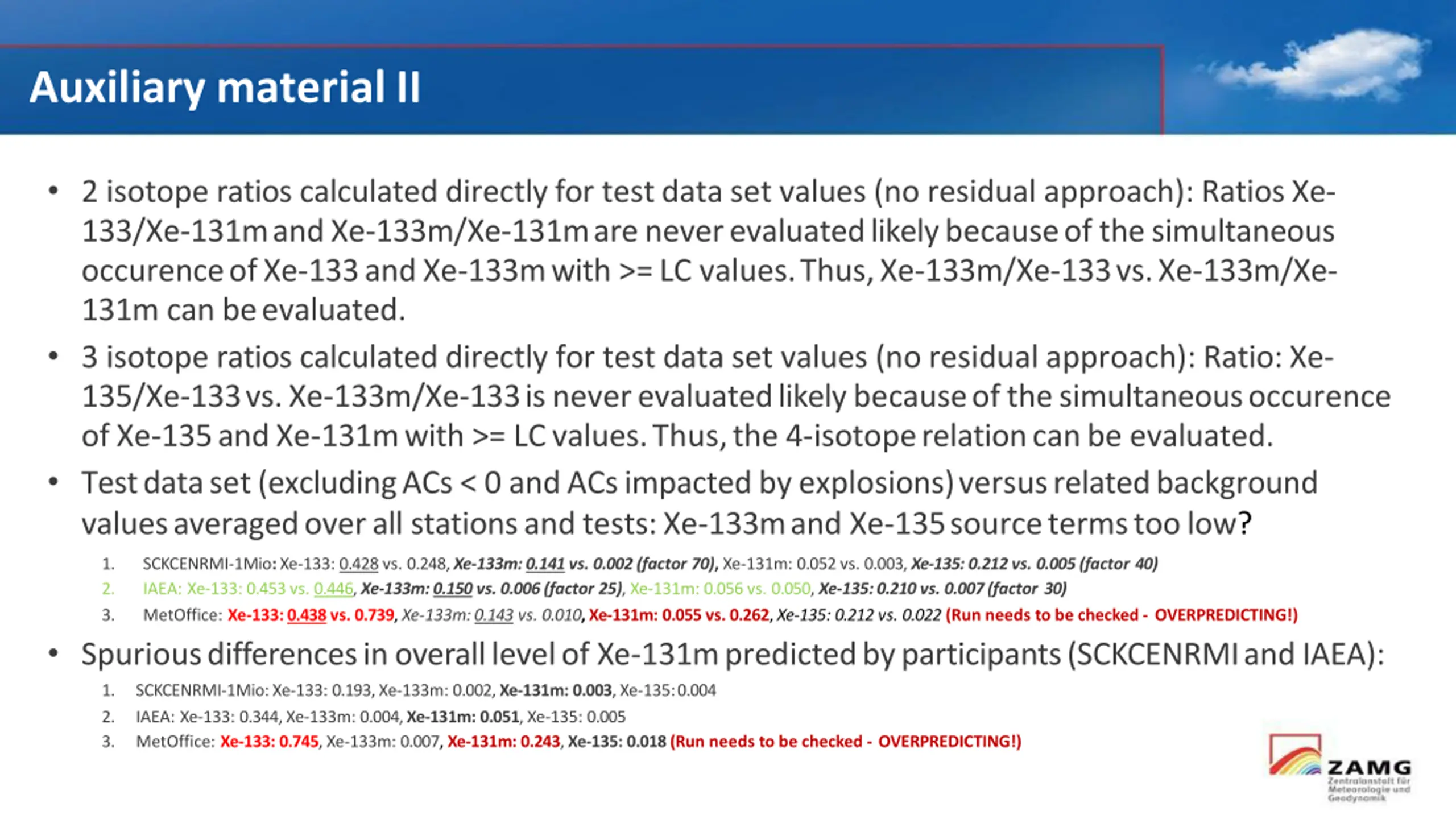 Auxiliary materialII 2 isotope ratios calculated directly for test data set values (no residual approach): Ratios Xe- 133/Xe-131mandXe-133m/Xe-131mareneverevaluatedlikelybecauseof thesimultaneous occurenceofXe-133andXe-133mwith >=LC values.Thus,Xe-133m/Xe-133vs.Xe-133m/Xe- 131m can beevaluated. 3 isotope ratios calculated directly for test data set values (no residual approach): Ratio: Xe- 135/Xe-133vs.Xe-133m/Xe-133is neverevaluatedlikelybecauseofthesimultaneousoccurence ofXe-135andXe-131mwith >= LCvalues.Thus,the 4-isotoperelationcanbe evaluated. Testdataset(excludingACs< 0 andACsimpactedbyexplosions)versusrelatedbackground valuesaveragedoverall stationsandtests:Xe-133mand Xe-135sourcetermstoolow? SCKCENRMI-1Mio: Xe-133: 0.428 vs. 0.248, Xe-133m: 0.141vs. 0.002 (factor 70), Xe-131m: 0.052 vs. 0.003, Xe-135: 0.212 vs. 0.005 (factor 40) IAEA: Xe-133: 0.453 vs. 0.446, Xe-133m: 0.150vs. 0.006 (factor 25), Xe-131m: 0.056 vs. 0.050, Xe-135: 0.210 vs. 0.007 (factor 30) MetOffice: Xe-133: 0.438vs. 0.739, Xe-133m: 0.143 vs. 0.010, Xe-131m: 0.055 vs. 0.262, Xe-135: 0.212 vs. 0.022 (Run needs to be checked - OVERPREDICTING!) Spuriousdifferencesinoveralllevelof Xe-131mpredictedbyparticipants(SCKCENRMIandIAEA): 1. 2. 3. 1. 2. 3. SCKCENRMI-1Mio: Xe-133: 0.193, Xe-133m: 0.002, Xe-131m: 0.003, Xe-135:0.004 IAEA: Xe-133: 0.344, Xe-133m: 0.004, Xe-131m: 0.051, Xe-135: 0.005 MetOffice: Xe-133: 0.745, Xe-133m: 0.007, Xe-131m: 0.243, Xe-135: 0.018 (Run needs to be checked - OVERPREDICTING!)