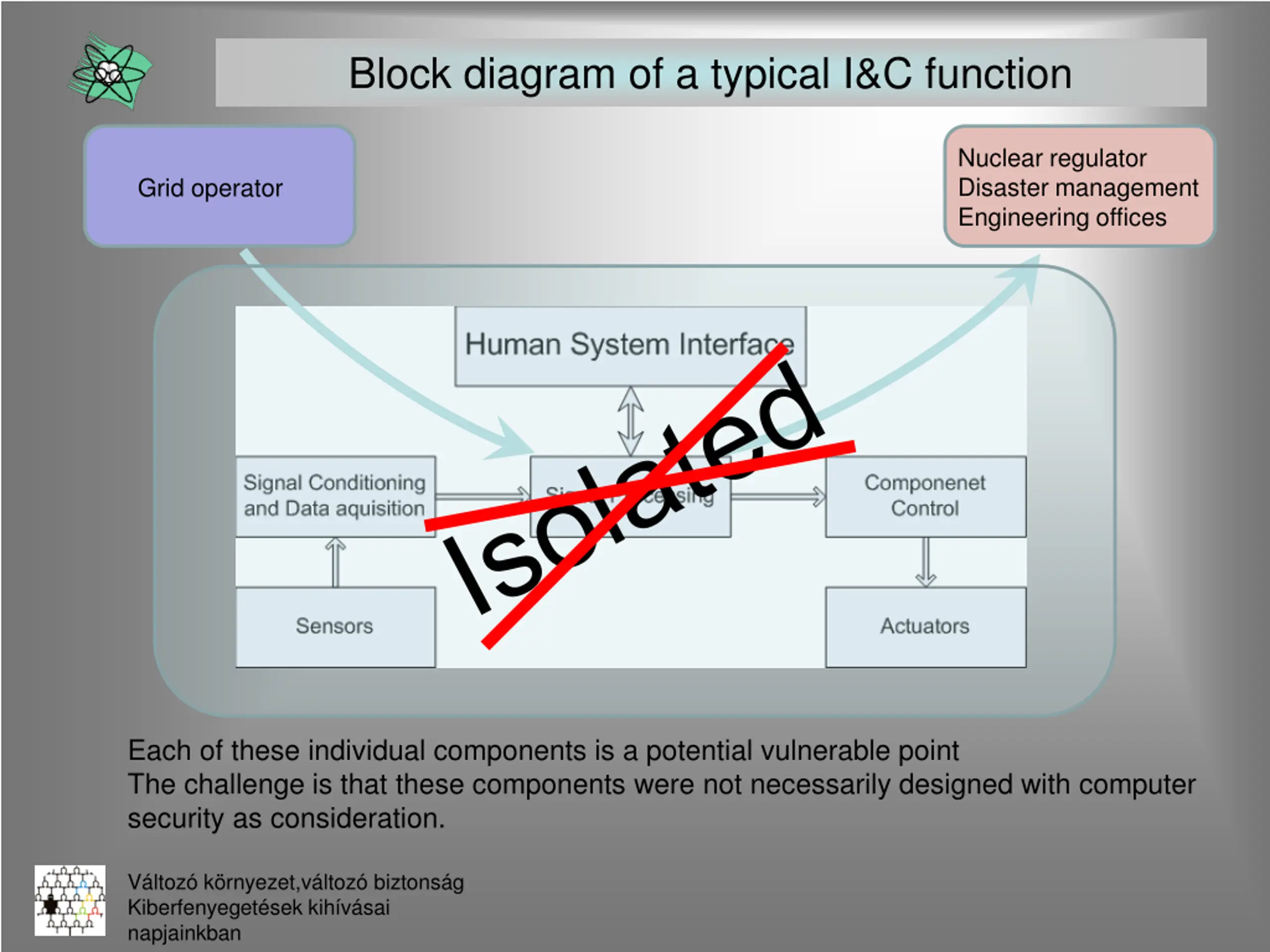 Block diagram of a typical I&C function Nuclear regulator Disaster management Engineering offices Grid operator Each of these individual components is a potential vulnerable point The challenge is that these components were not necessarily designed with computer security as consideration. V ltoz k rnyezet,v ltoz biztons g Kiberfenyeget sek kih v sai napjainkban