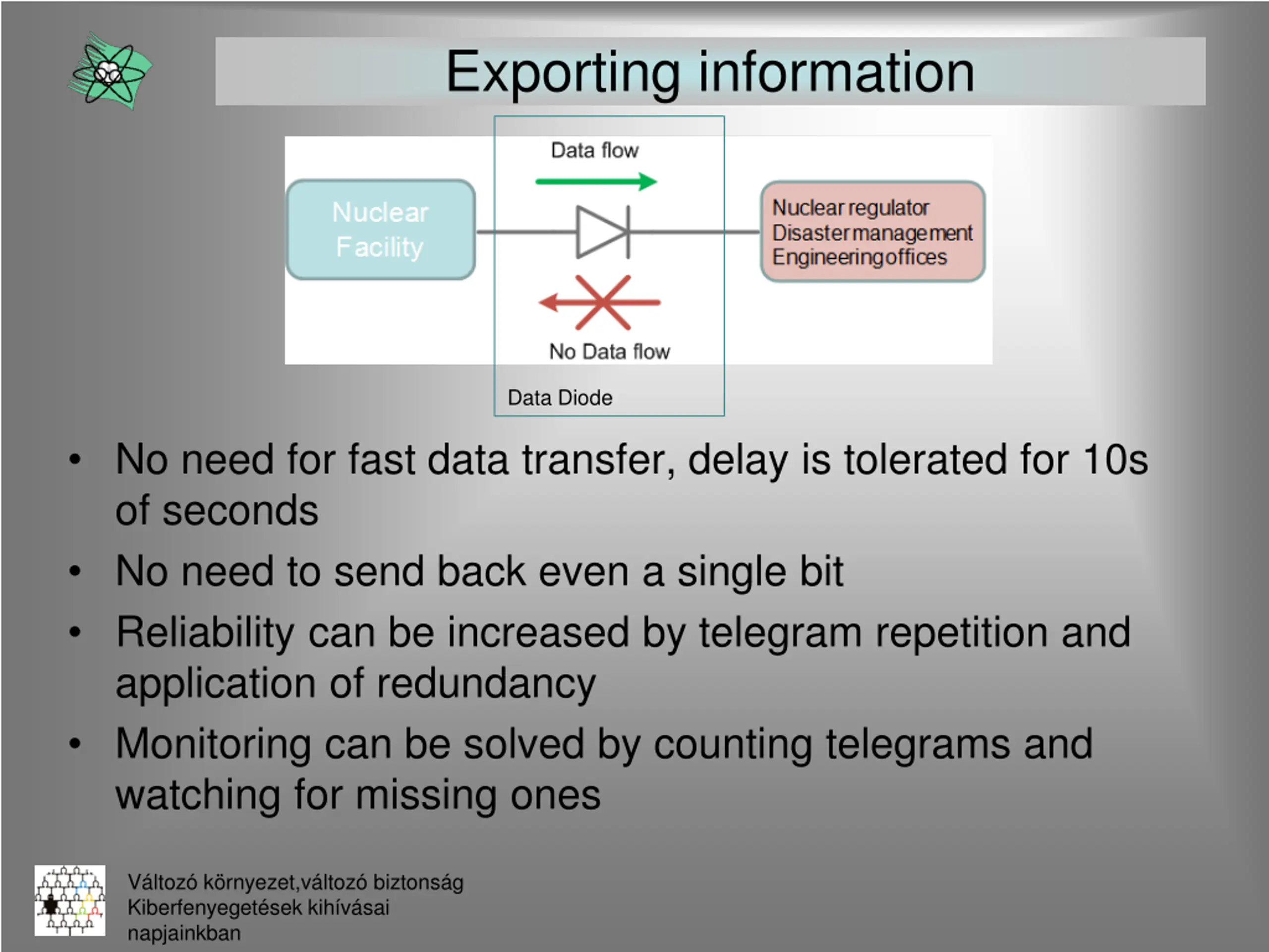 Exporting information Data Diode No need for fast data transfer, delay is tolerated for 10s of seconds No need to send back even a single bit Reliability can be increased by telegram repetition and application of redundancy Monitoring can be solved by counting telegrams and watching for missing ones V ltoz k rnyezet,v ltoz biztons g Kiberfenyeget sek kih v sai napjainkban