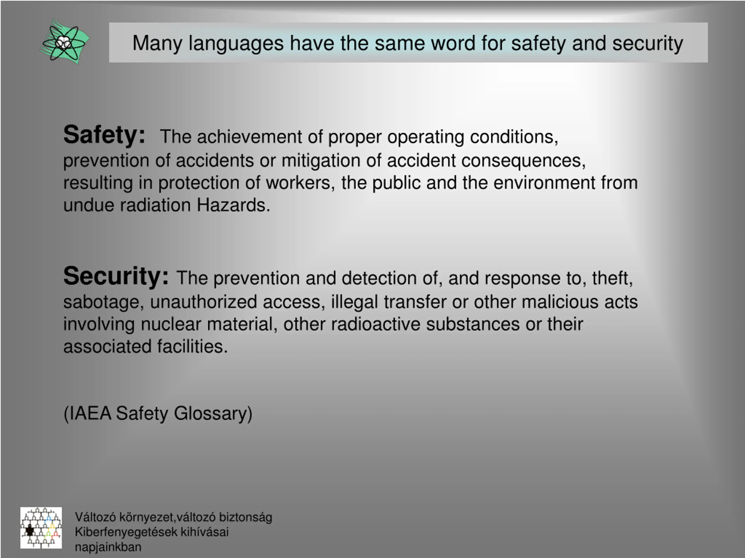 Many languages have the same word for safety and security Safety: The achievement of proper operating conditions, prevention of accidents or mitigation of accident consequences, resulting in protection of workers, the public and the environment from undue radiation Hazards. Security: The prevention and detection of, and response to, theft, sabotage, unauthorized access, illegal transfer or other malicious acts involving nuclear material, other radioactive substances or their associated facilities. (IAEA Safety Glossary) V ltoz k rnyezet,v ltoz biztons g Kiberfenyeget sek kih v sai napjainkban