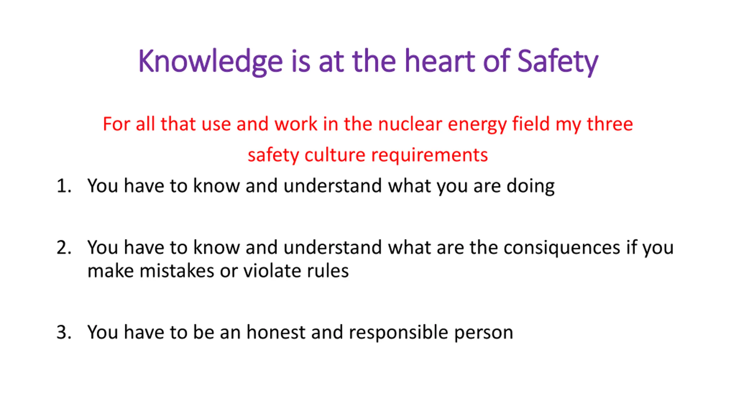 Knowledge is at the heart of Safety Knowledge is at the heart of Safety For all that use and work in the nuclear energy field my three safety culture requirements 1. You have to know and understand what you are doing 2. You have to know and understand what are the consiquences if you make mistakes or violate rules 3. You have to be an honest and responsible person