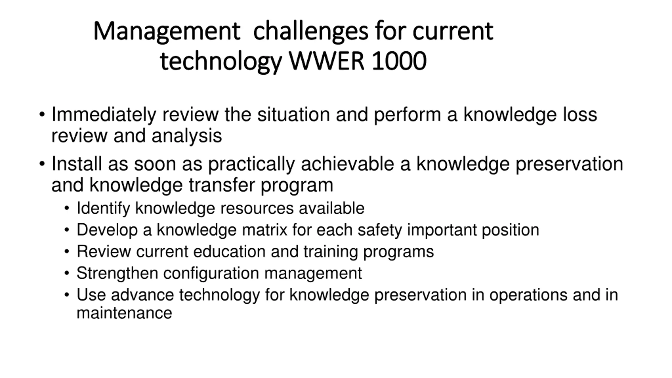 Management challenges for current Management challenges for current technology WWER 1000 technology WWER 1000 Immediately review the situation and perform a knowledge loss review and analysis Install as soon as practically achievable a knowledge preservation and knowledge transfer program Identify knowledge resources available Develop a knowledge matrix for each safety important position Review current education and training programs Strengthen configuration management Use advance technology for knowledge preservation in operations and in maintenance